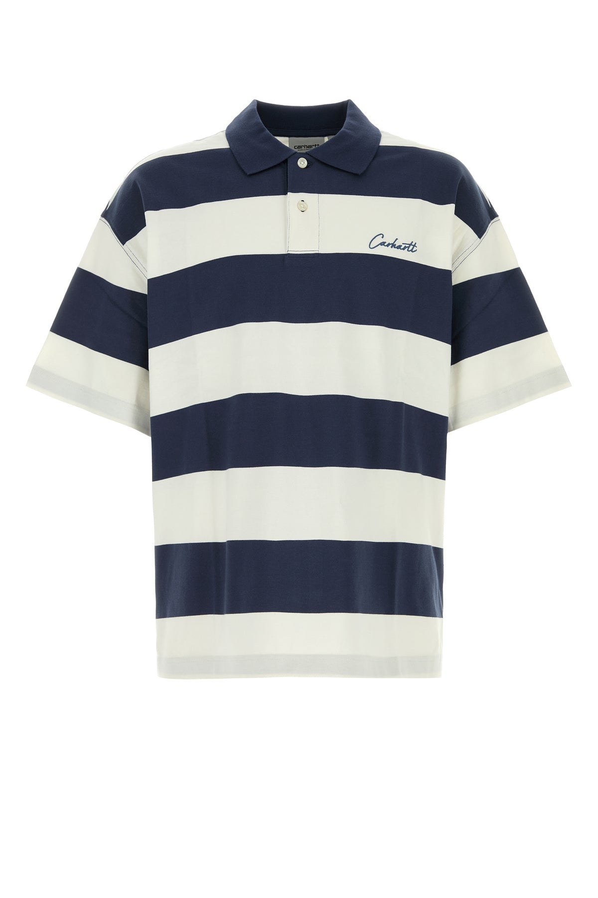 Oversize polo shirt realized in pure organic cotton characterized by embroidered logo on the chest and striped embroidery on the entire surface.