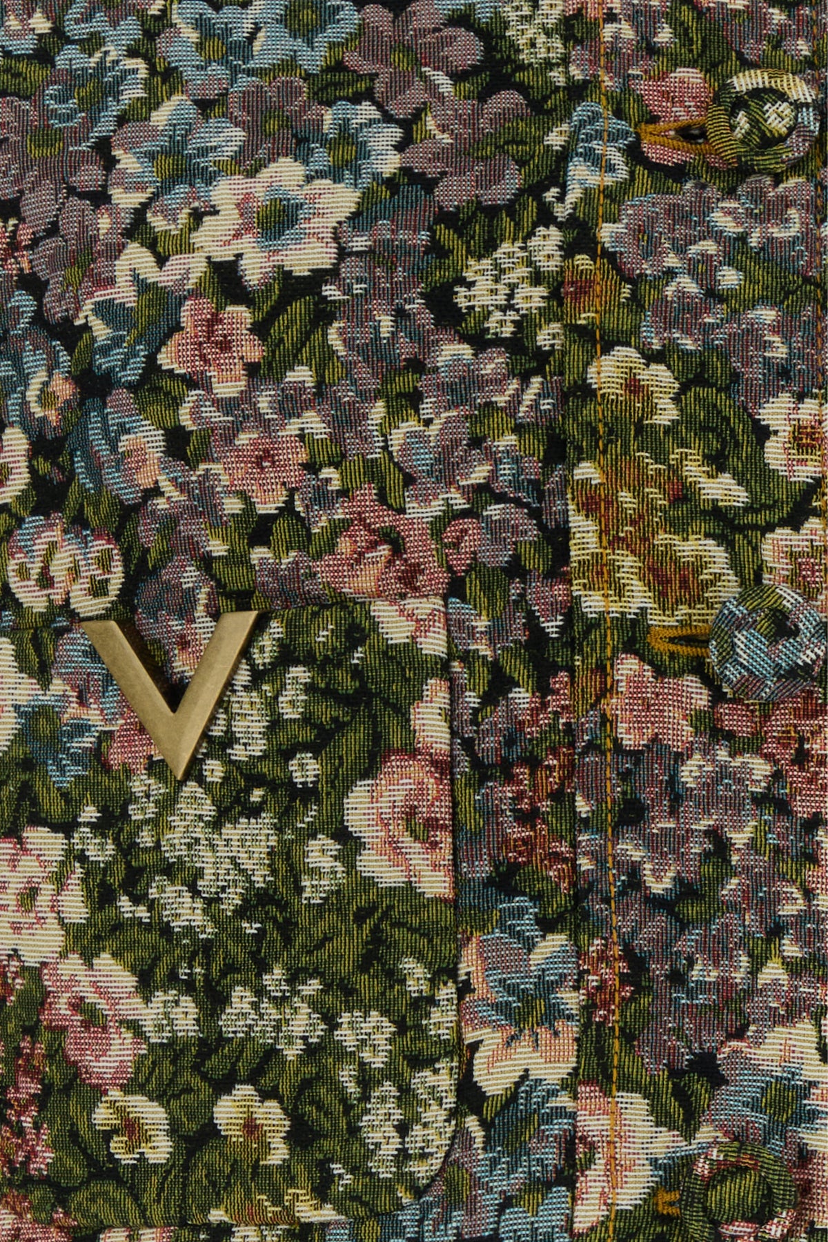 Cropped-cut blazer realized in Jacquard characterized by Fiorellini embroidery on the entire surface enriched by metal V Gold detail at the front.
