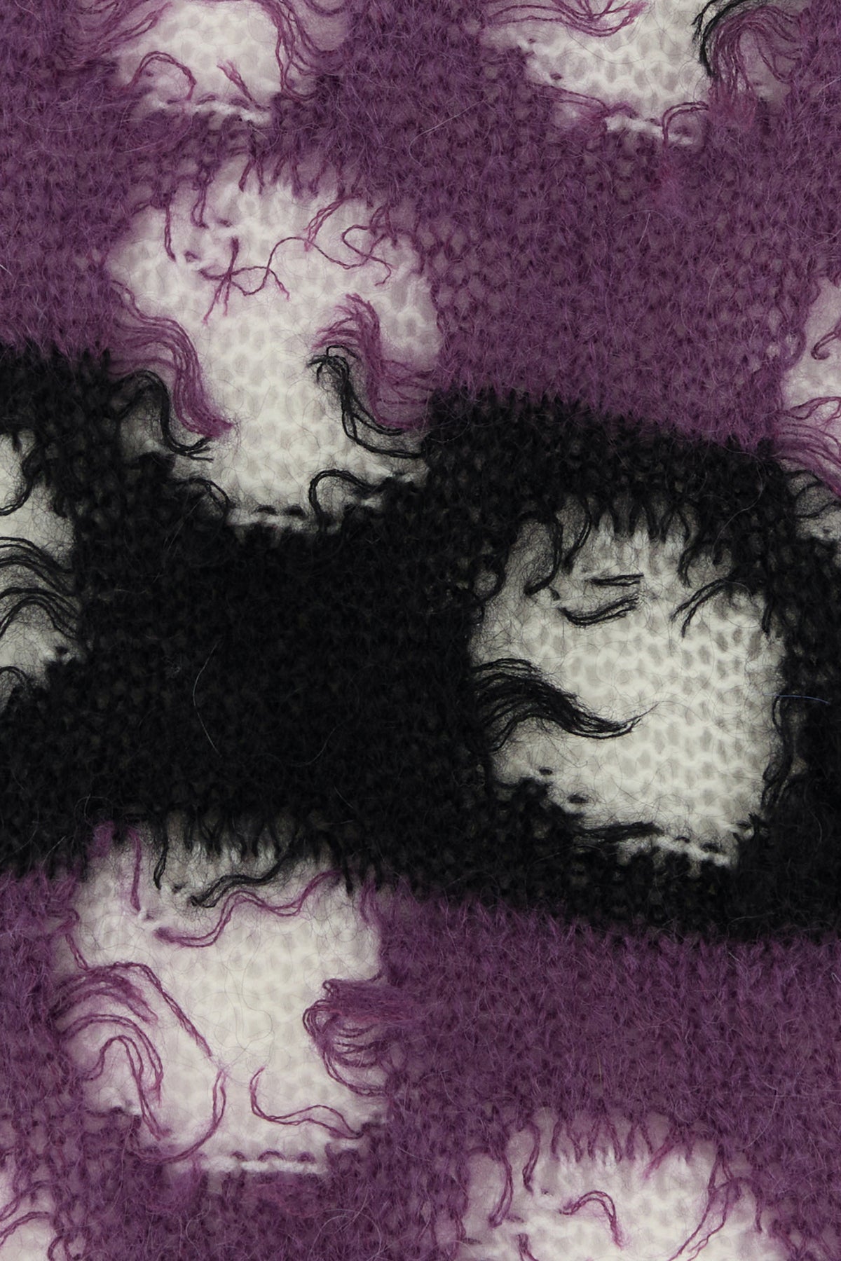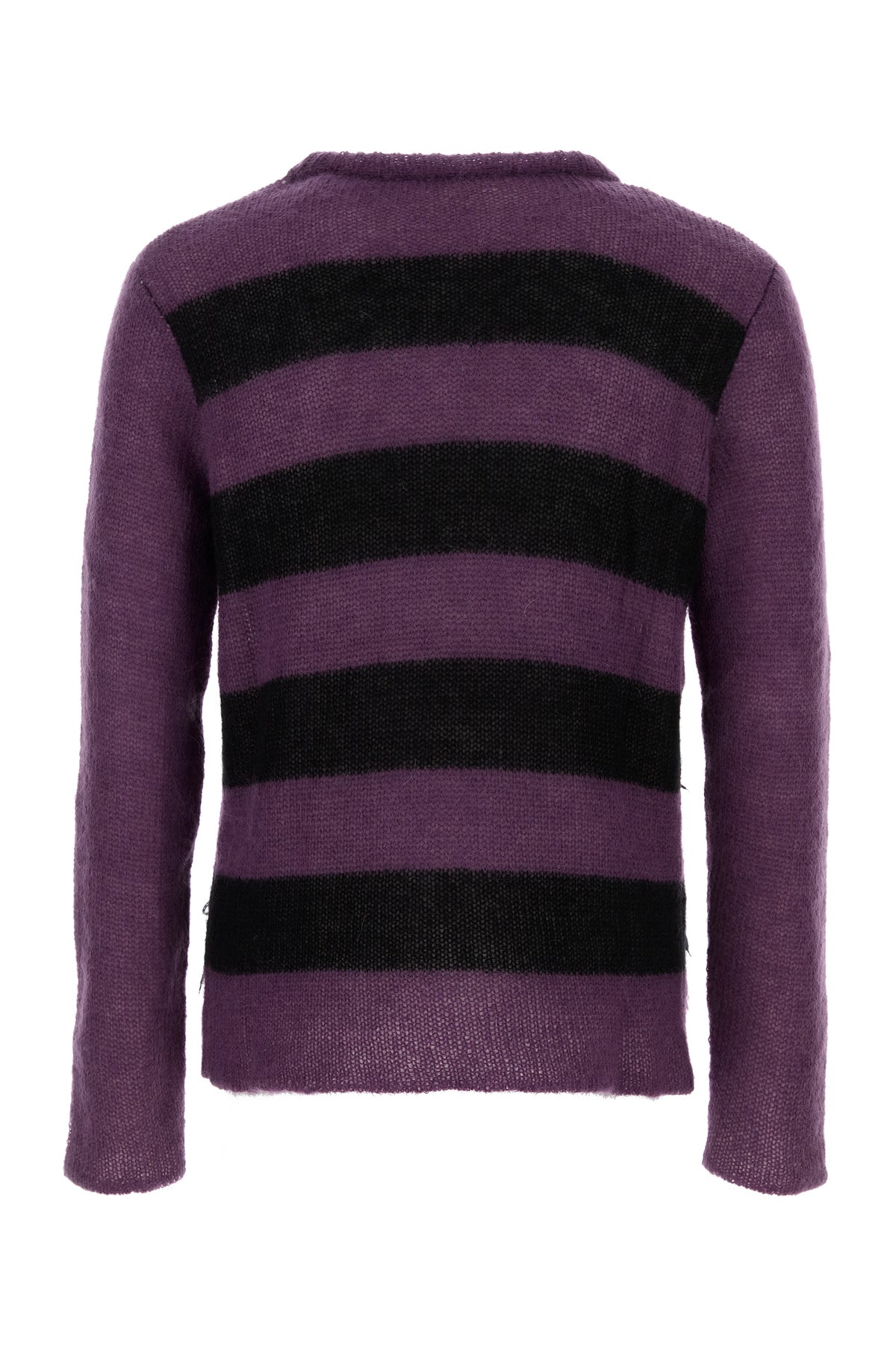 Sweater realized in virgin wool blend characterized by intentional rips at the front and striped embroidery at the back.