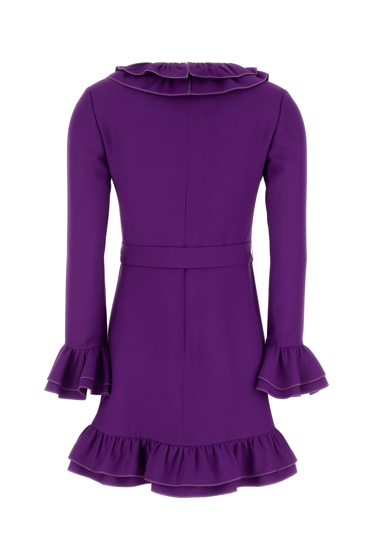 Mini dress realized in virgin wool and silk characterized by flounces on the V neckline, on the cuffs and on the hemline.