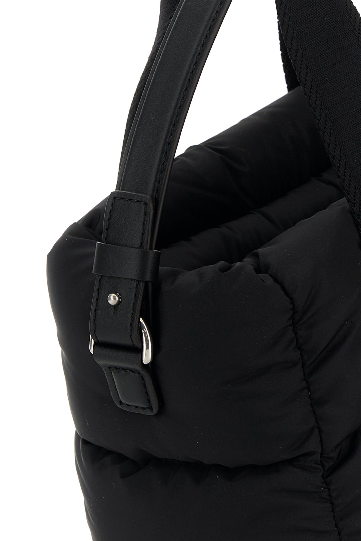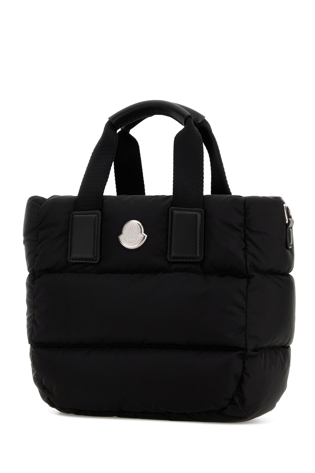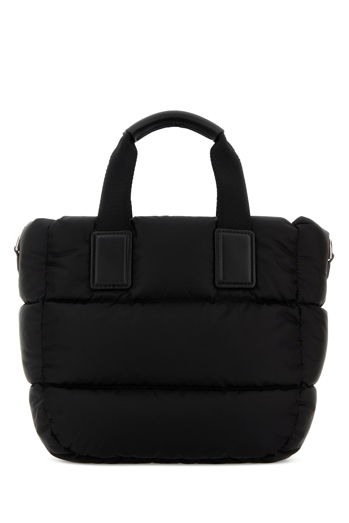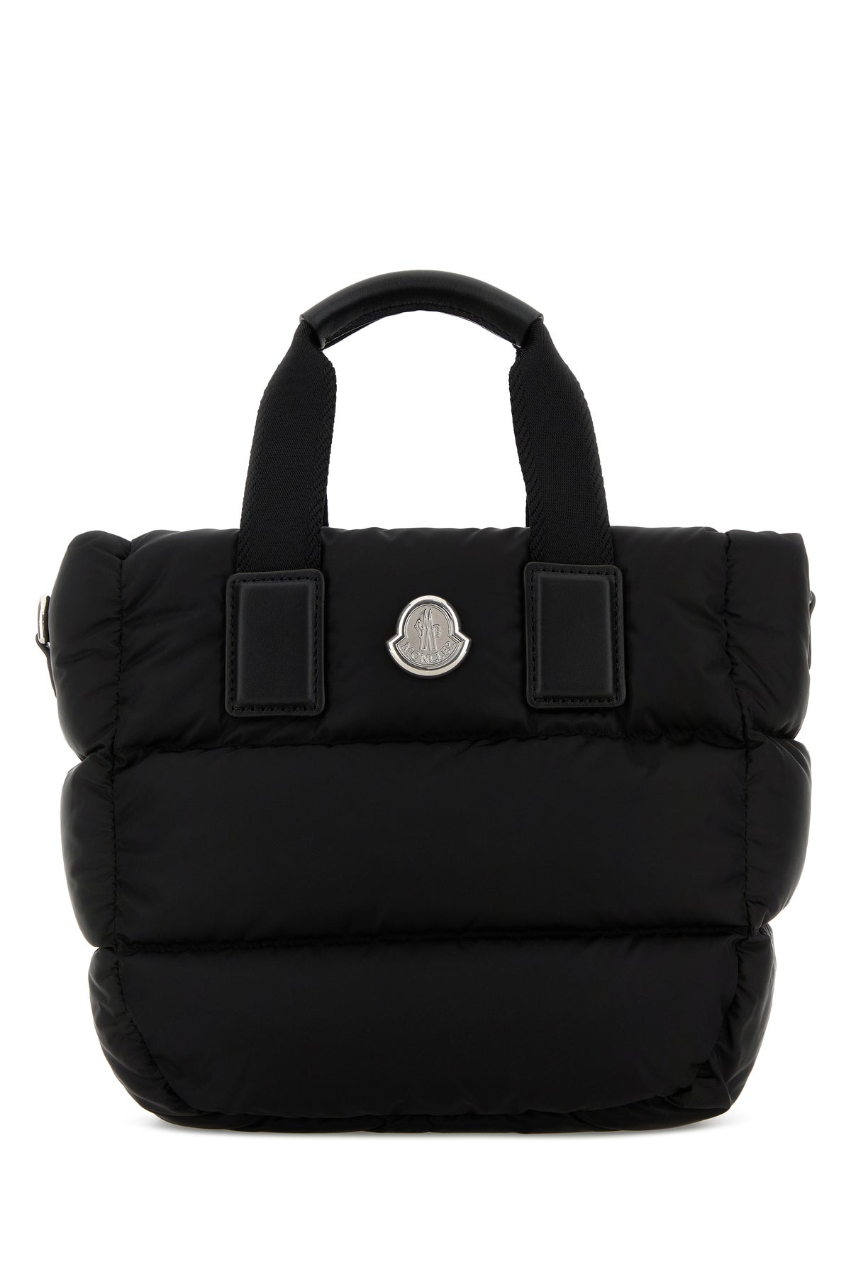 Handbag realized in quilted fabric enriched by logoed metal detail at the front.