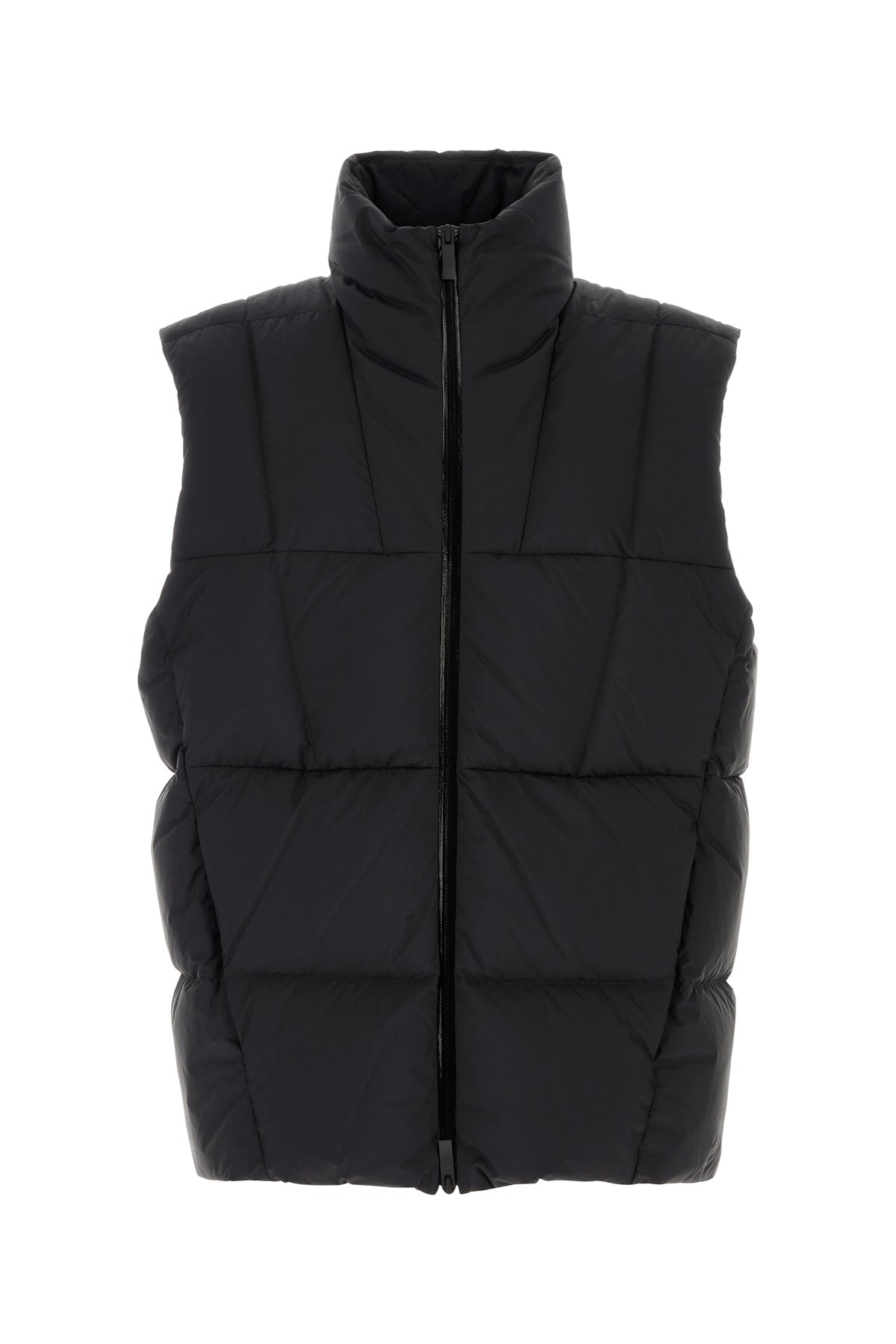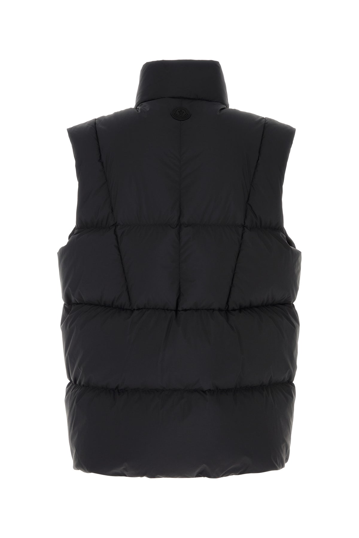 Sleeveless down jacket realized in quilted nylon enriched by rubberized logoed patch at the back.