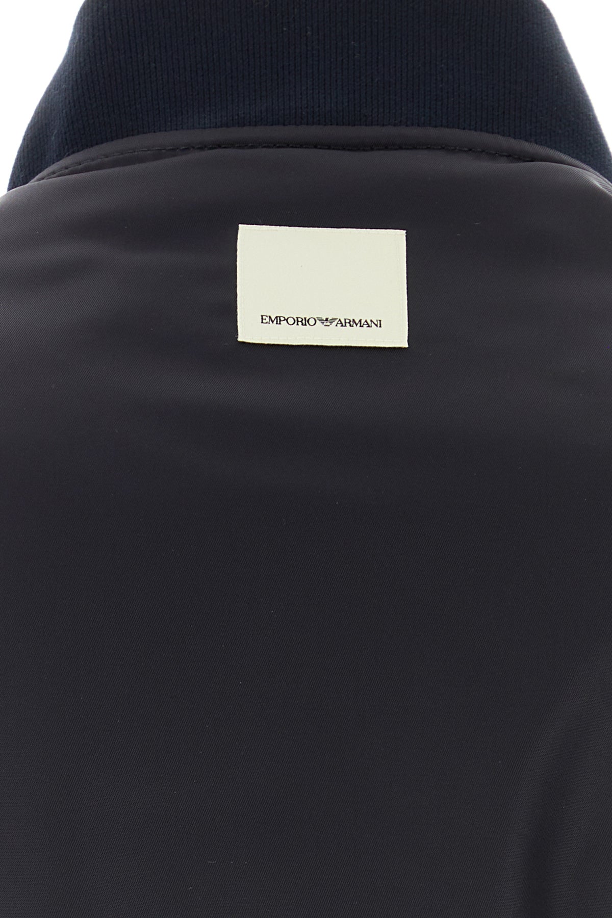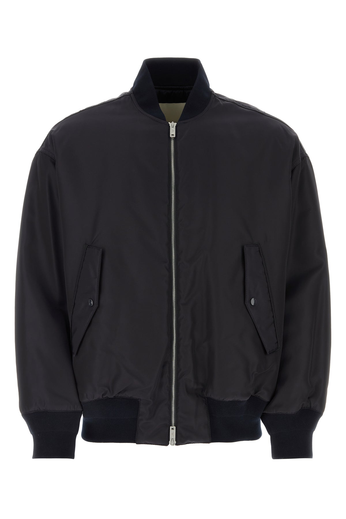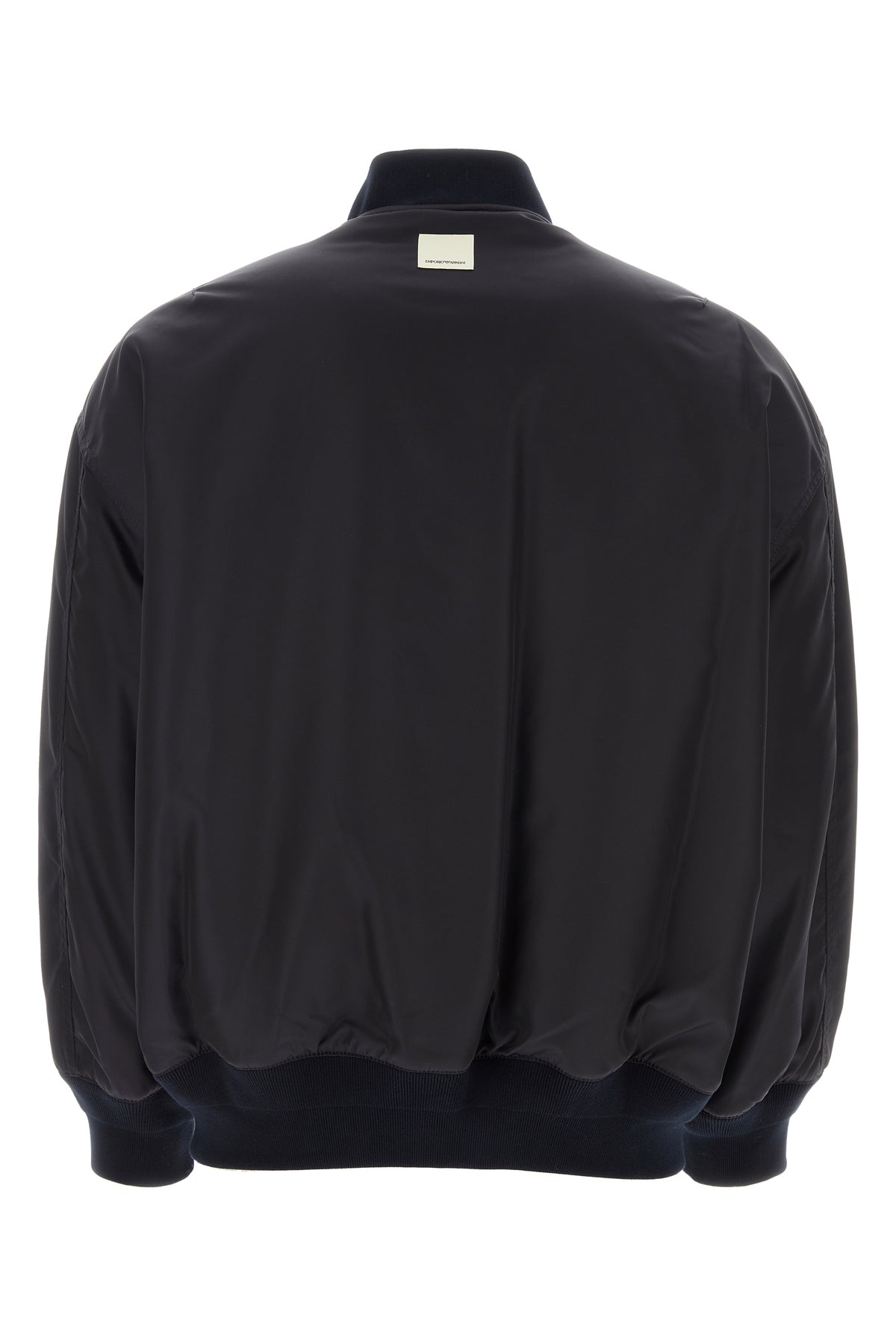 Padded bomber jacket realized in nylon with tonal ribbed fabric on the collar, on the cuffs and on the hemline enriched by contrasting logoed label at the back.