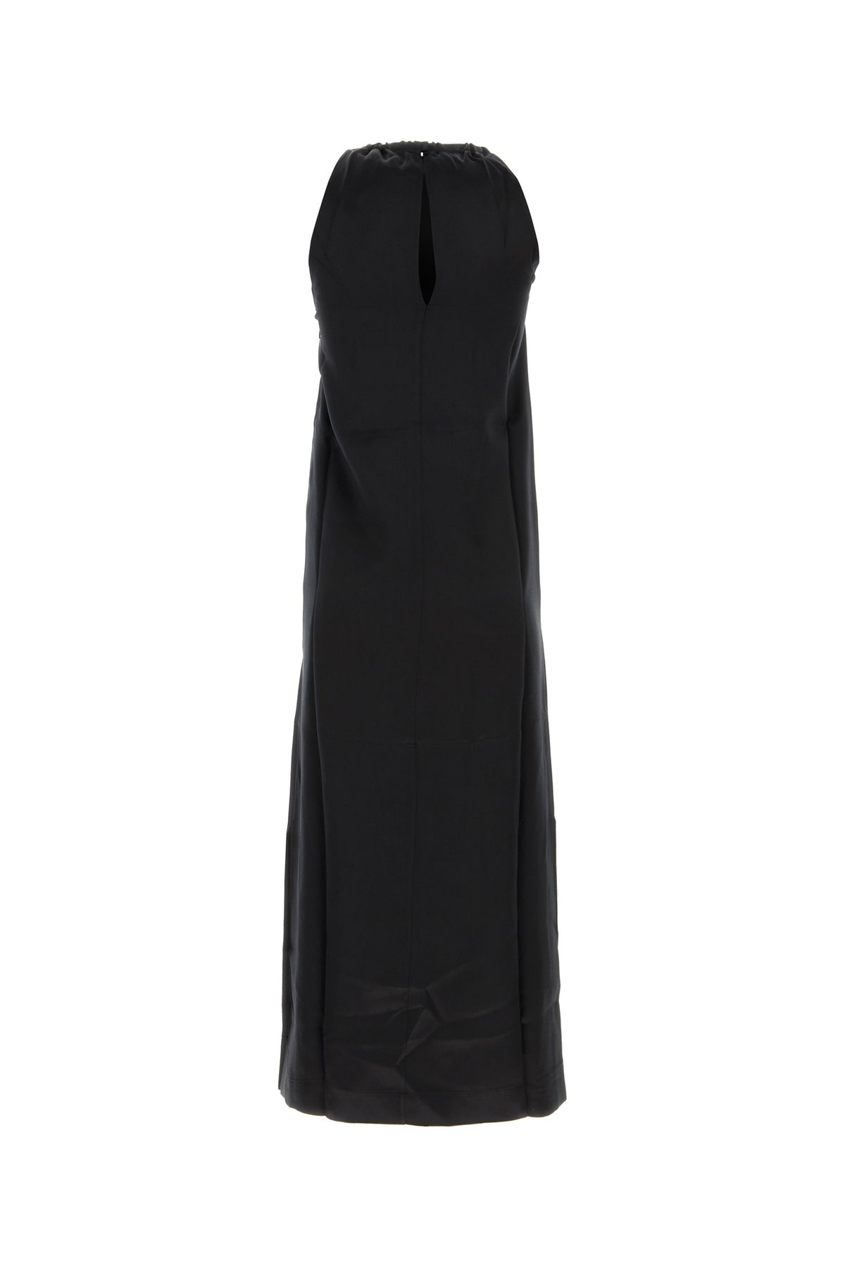 Dress realized in satin characterized by halter neckline.