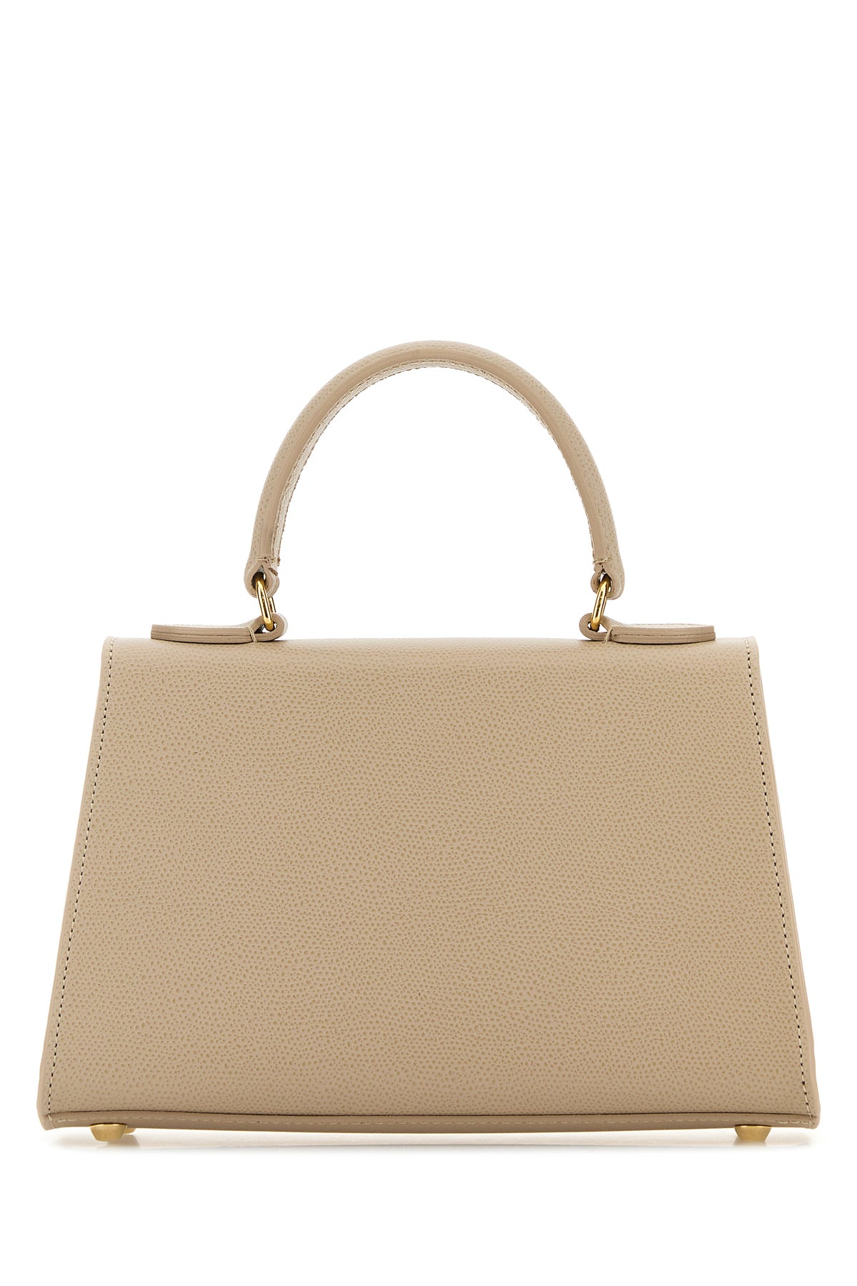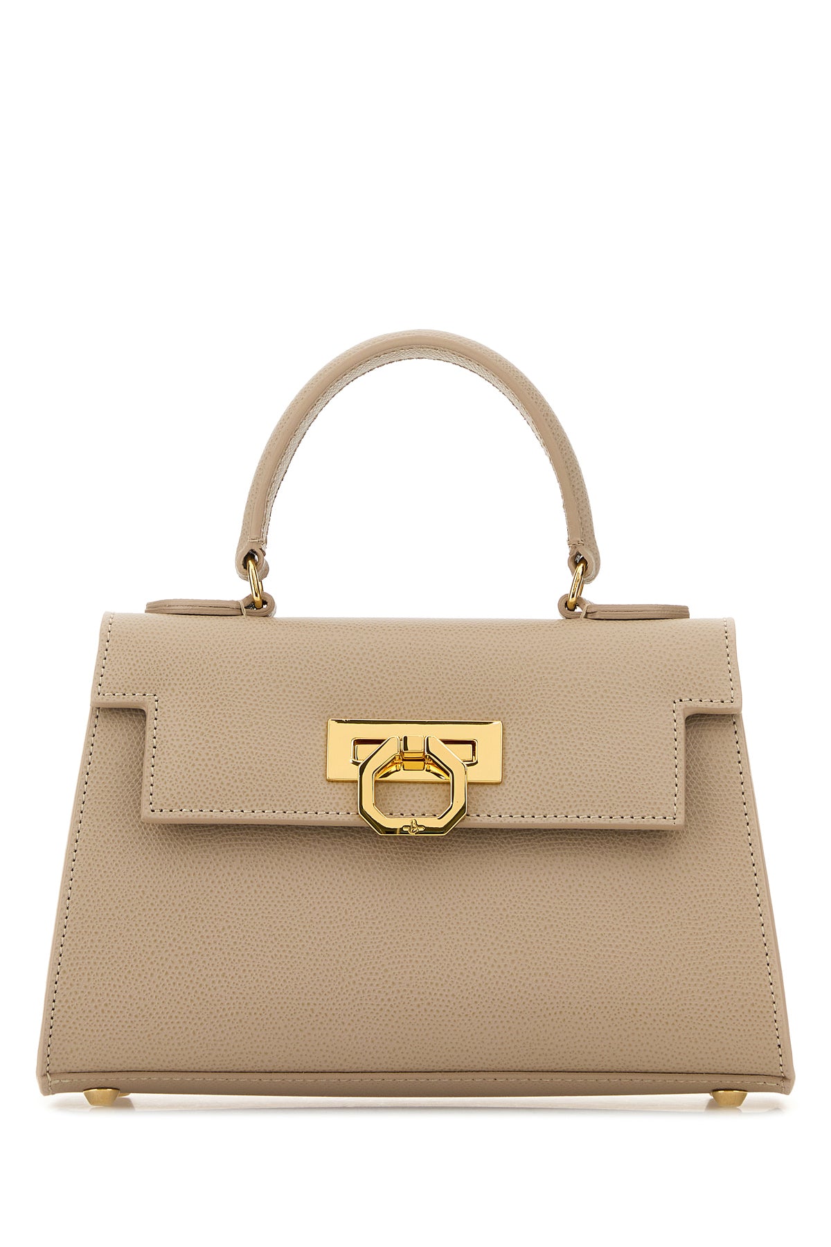 Handbag realized in grained calf leather characterized by snap-fit closure.