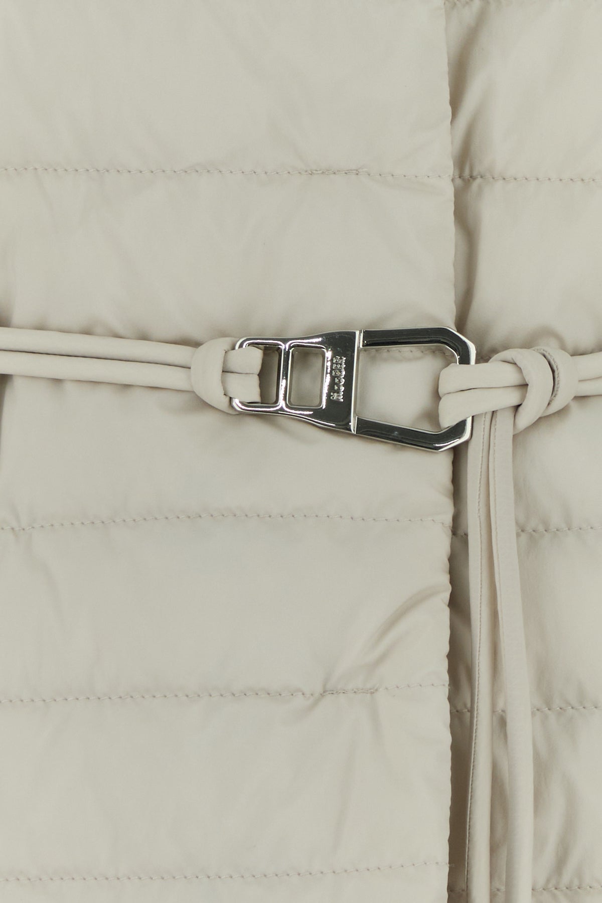 Down jacket realized in quilted nylon enriched by fabric belt at the waist.