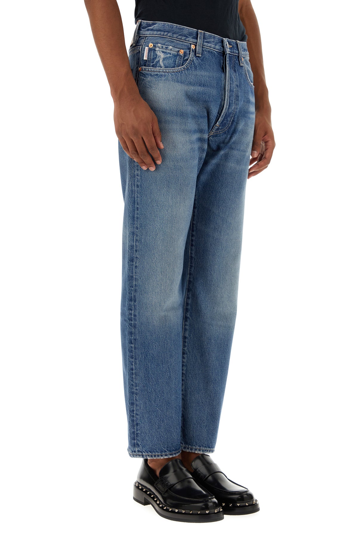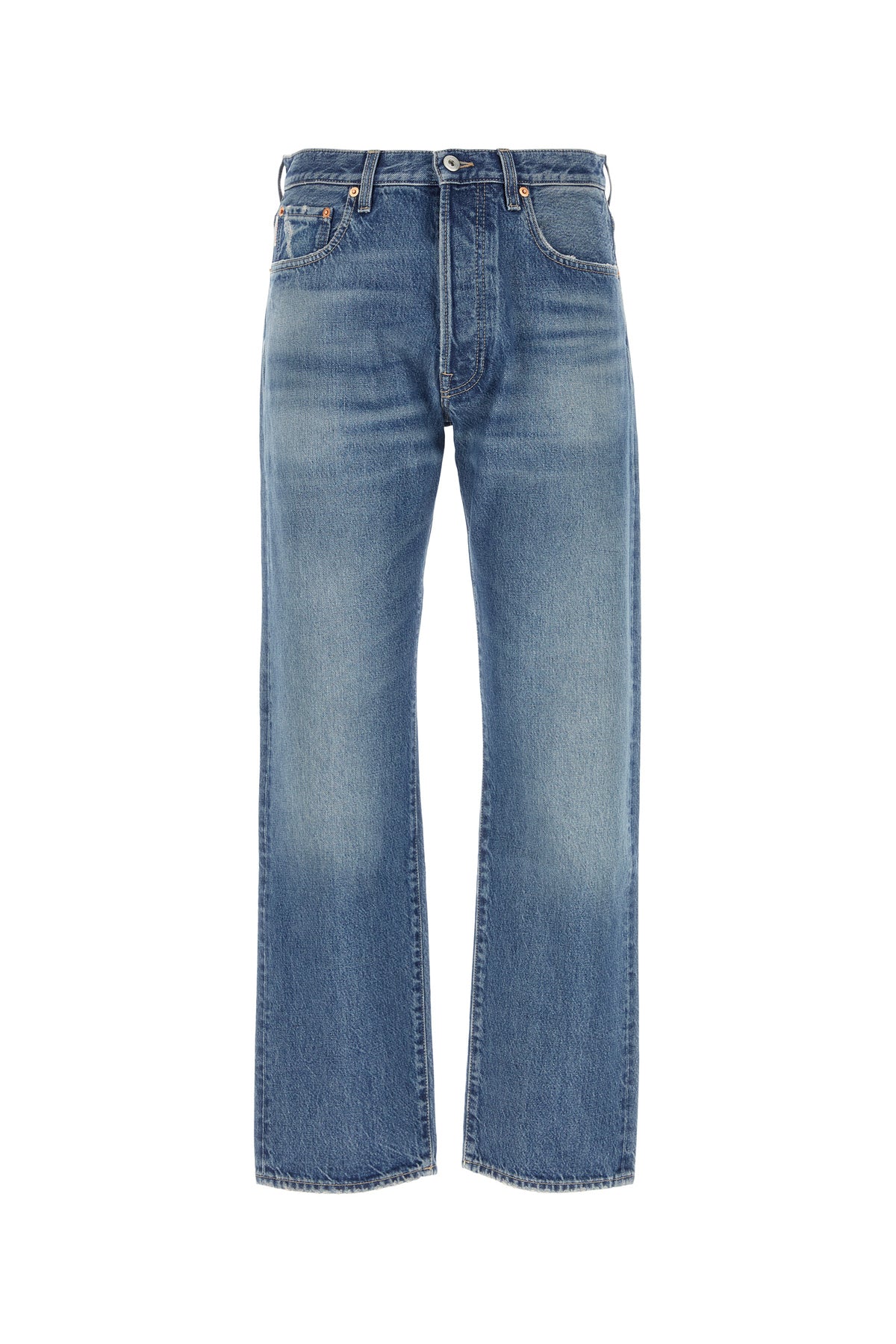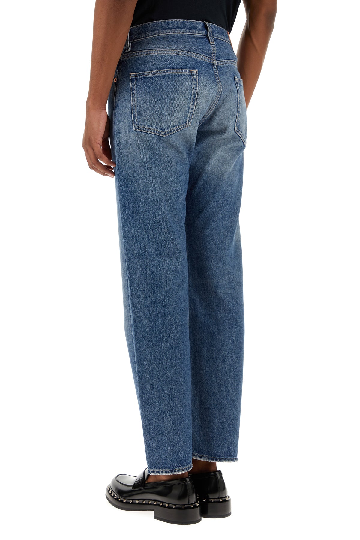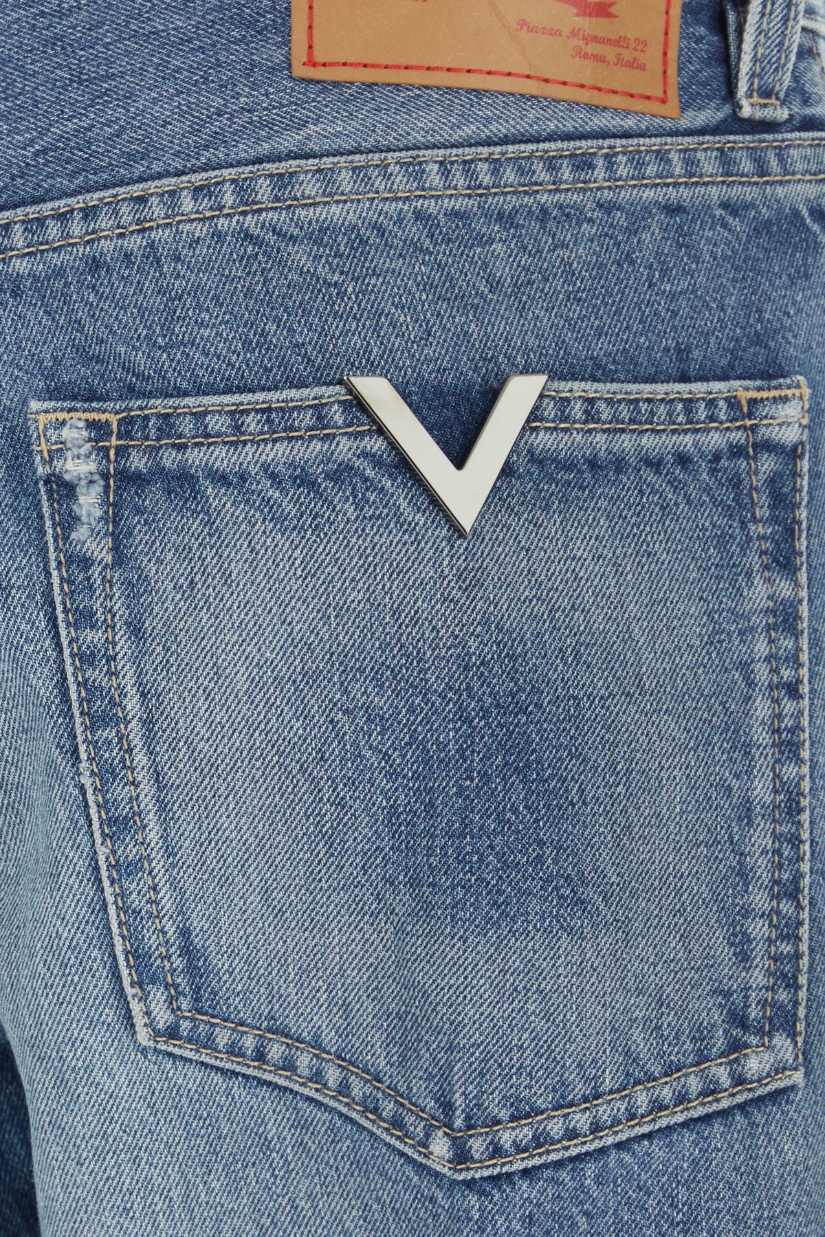 Regular jeans realized in stonewashed and distressed pure cotton denim enriched by logoed metal detail at the back.