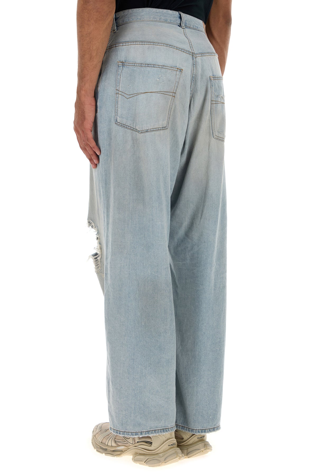 Jeans realized in stonewashed pure cotton denim characterized by intentional rips enriched by logoed label at the back.