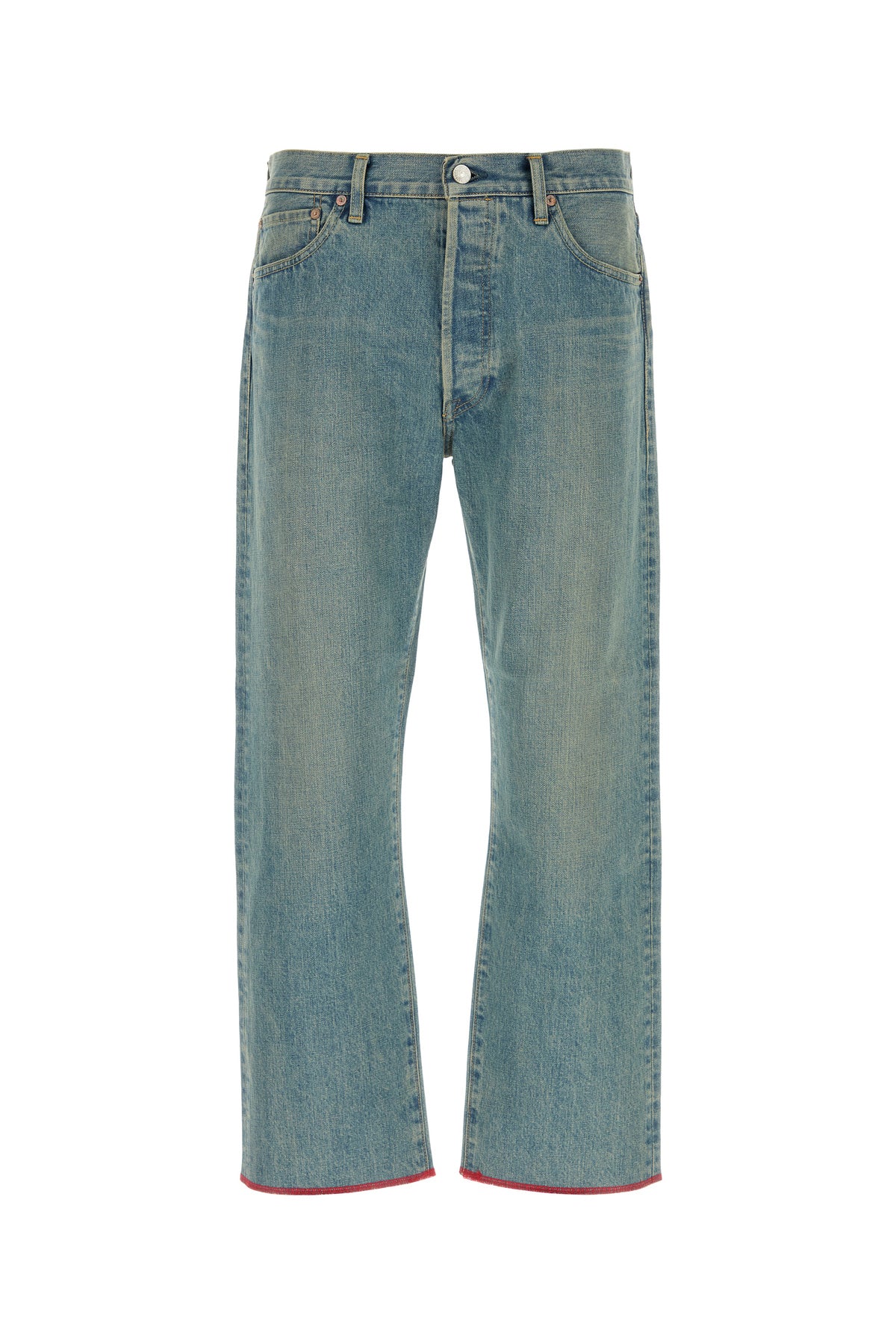 Jeans realized in vintage-effect stonewashed pure cotton denim enriched by logoed label at the back.