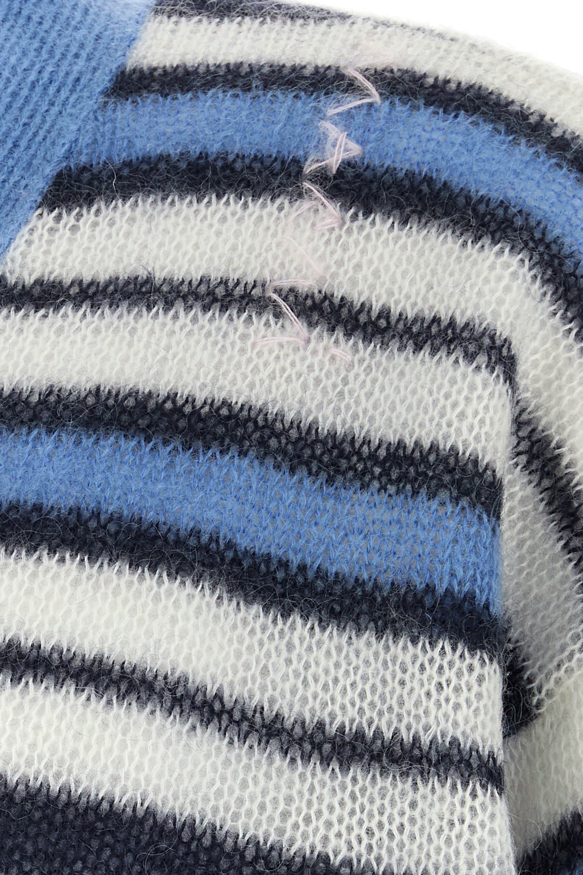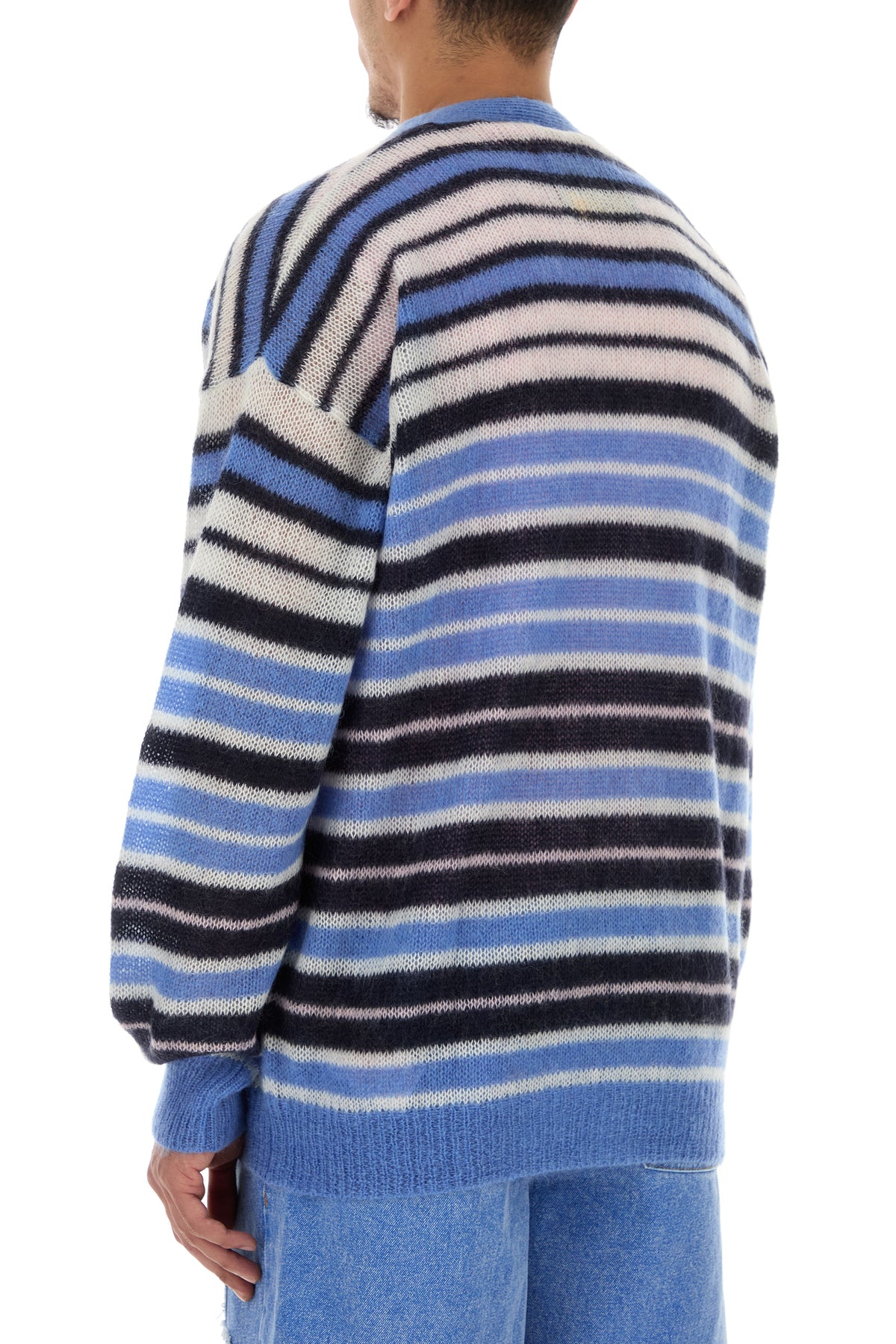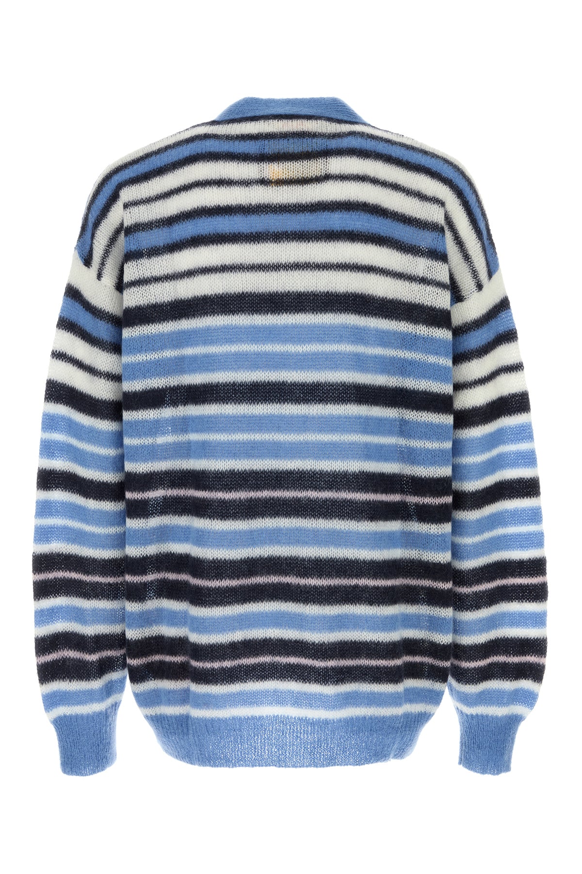 Cardigan realized in mohair blend characterized by striped embroidery on the entire surface.