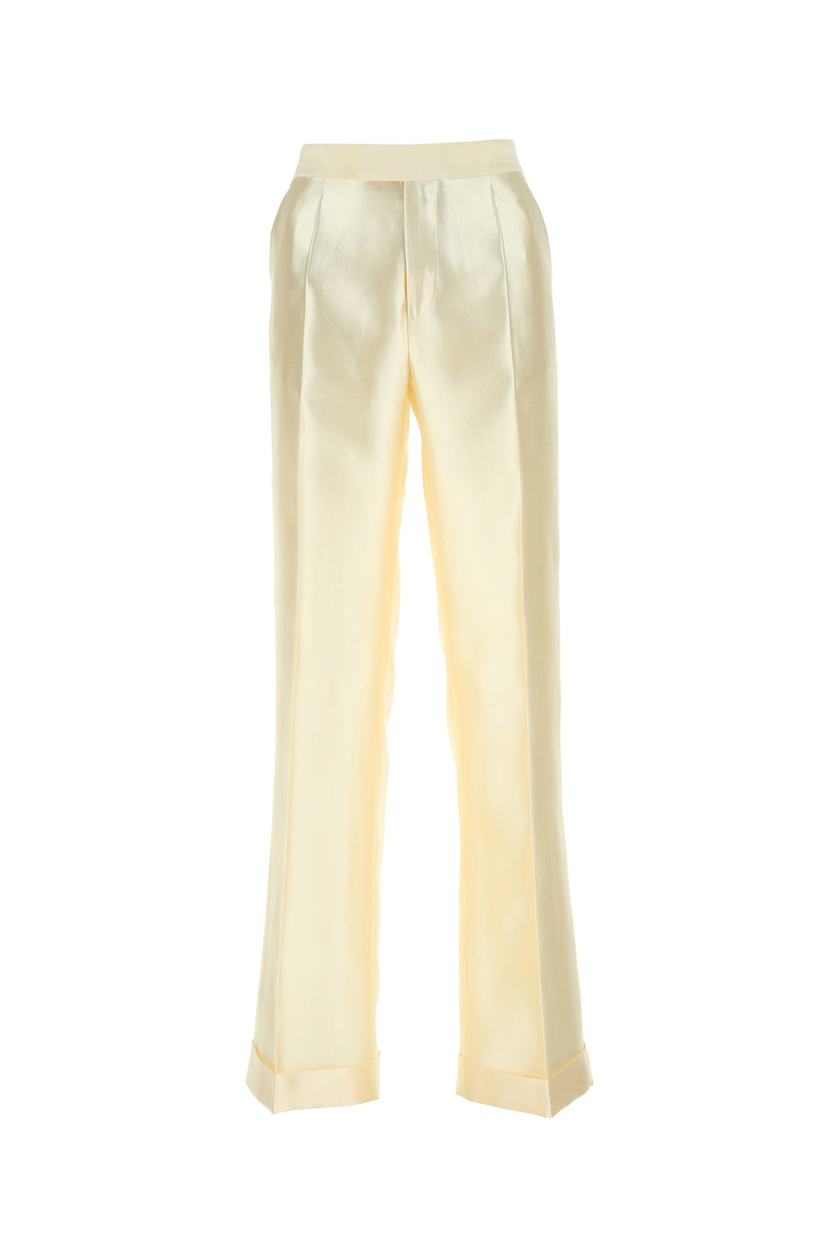 Wide-leg pant realized in laminated effect viscose blend characterized by central ironed pleats.