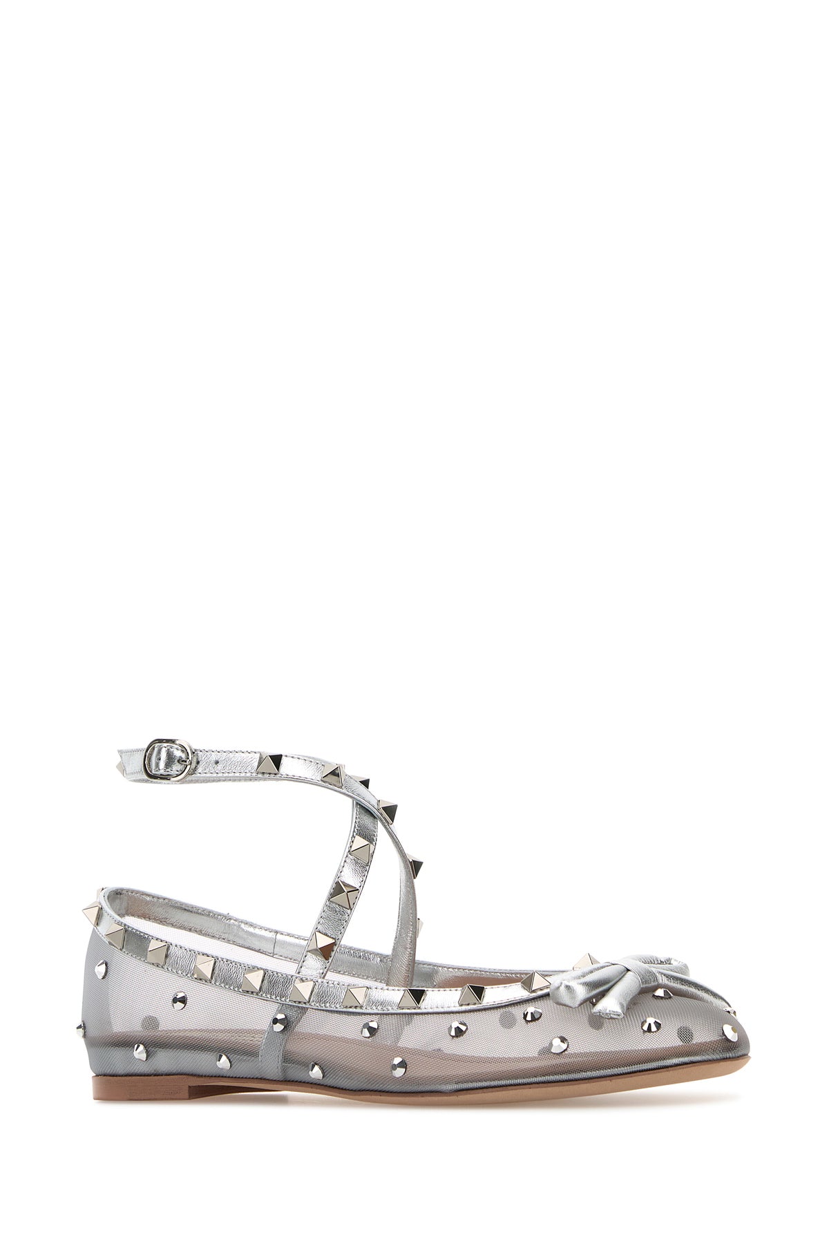 Ballerinas realized in mesh with laminated leather inserts enriched by decorative bow on the toe, decorative metal studs on the trimmings and rhinestones on the entire surface.