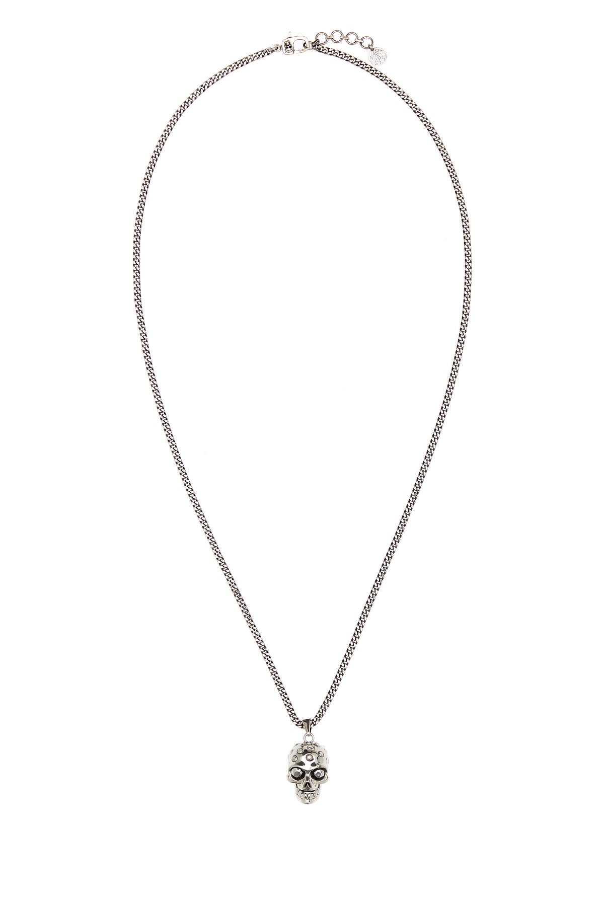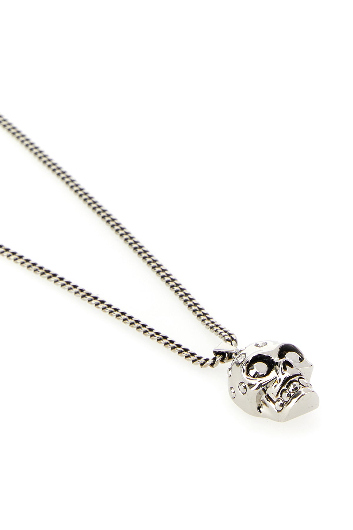 Necklace realzied in metal chain enriched by jeweled Skull charm.