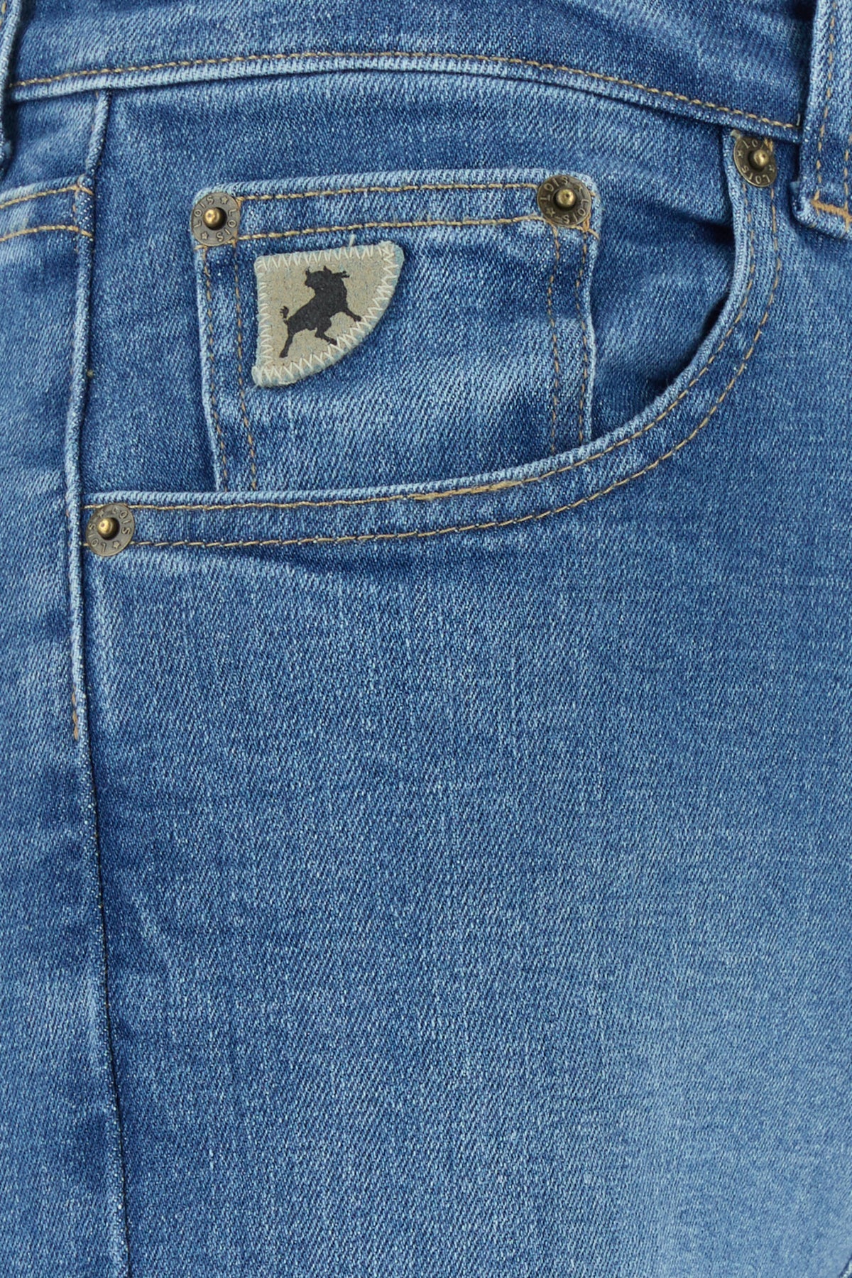 Flared leg jeans realized in stretch cotton blend denim enriched by contrasting logoed patches at the front and at the back.