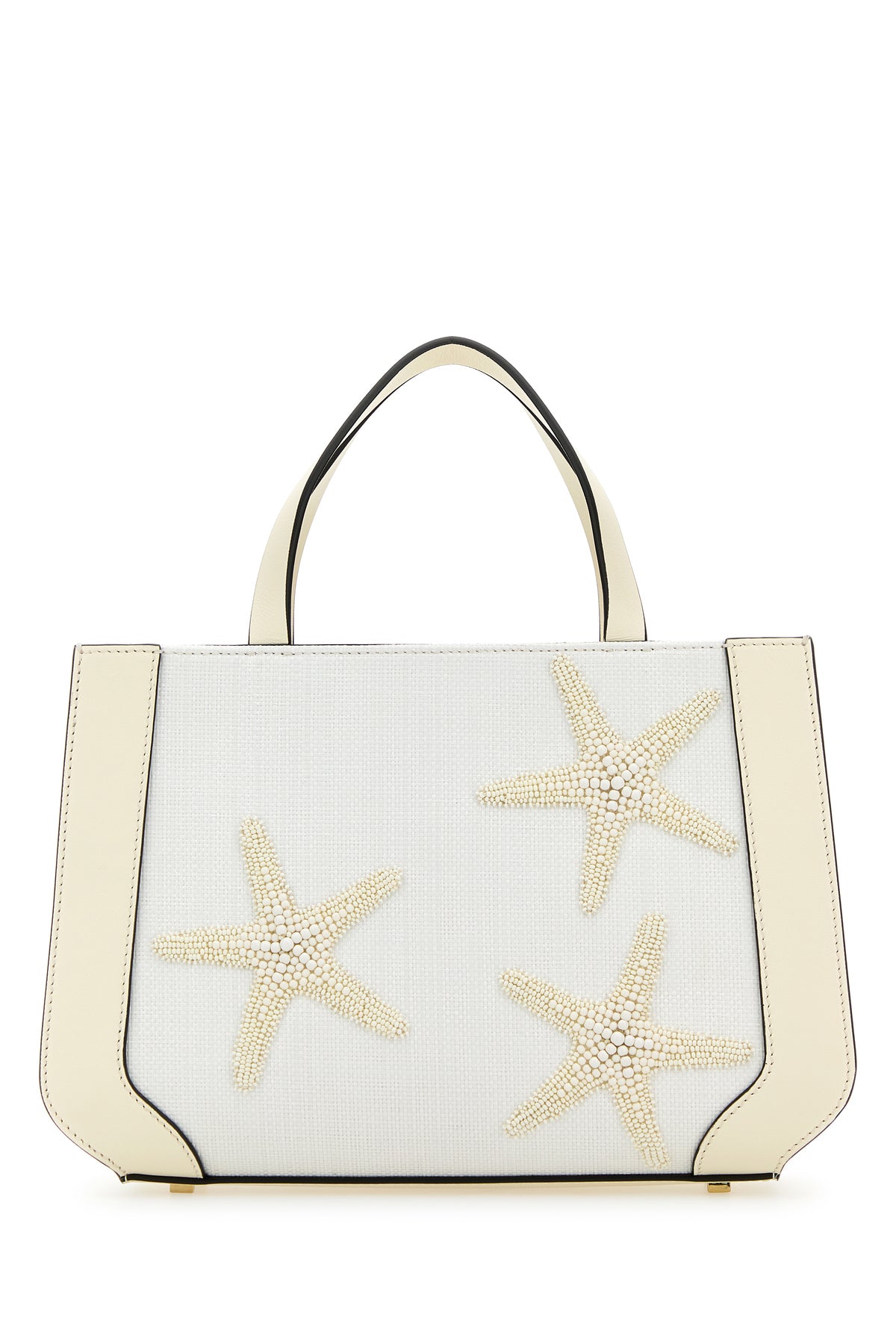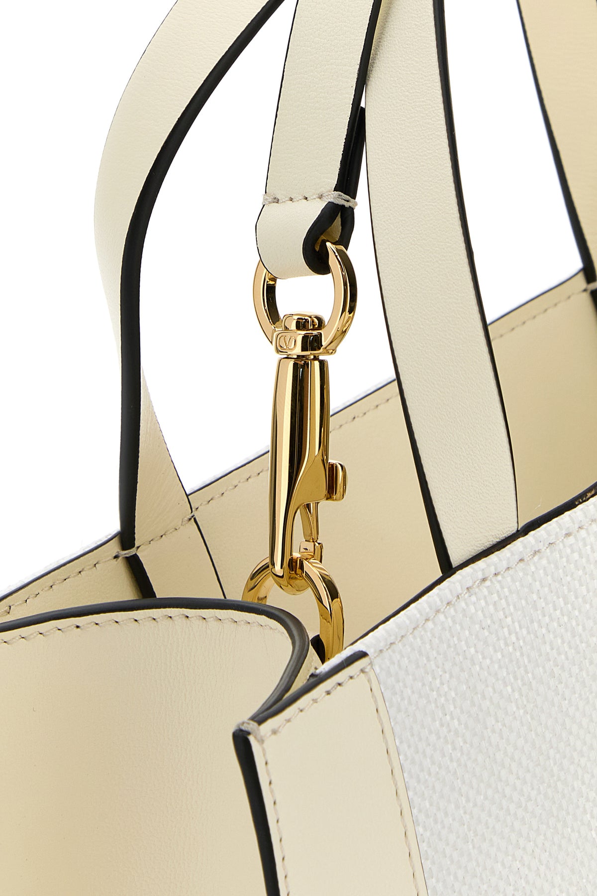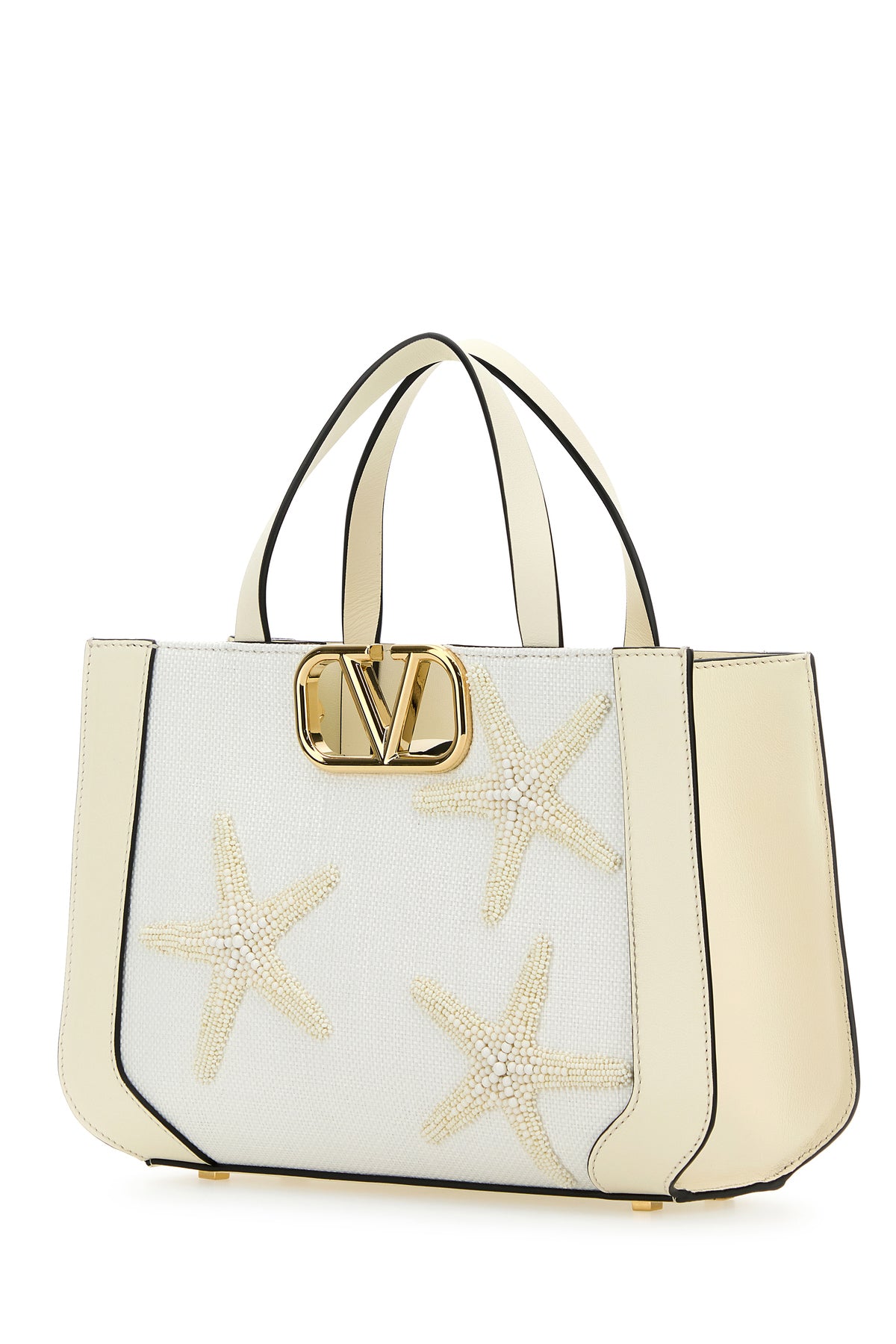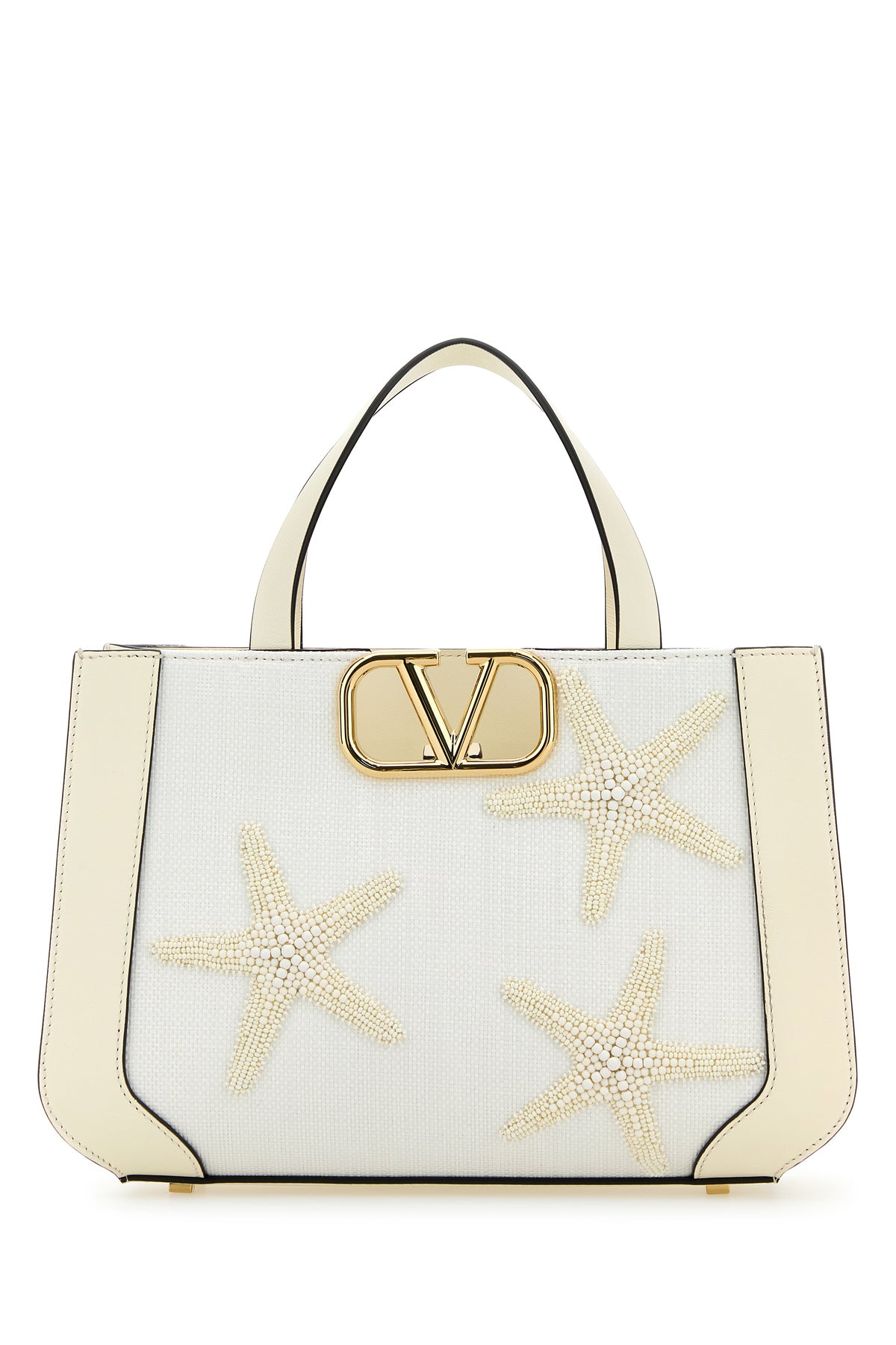 Handbag realized in fabric characterized by peculiar embroideries with beads at the front and at the back enriched by VLogo Signature metal detail at the front.