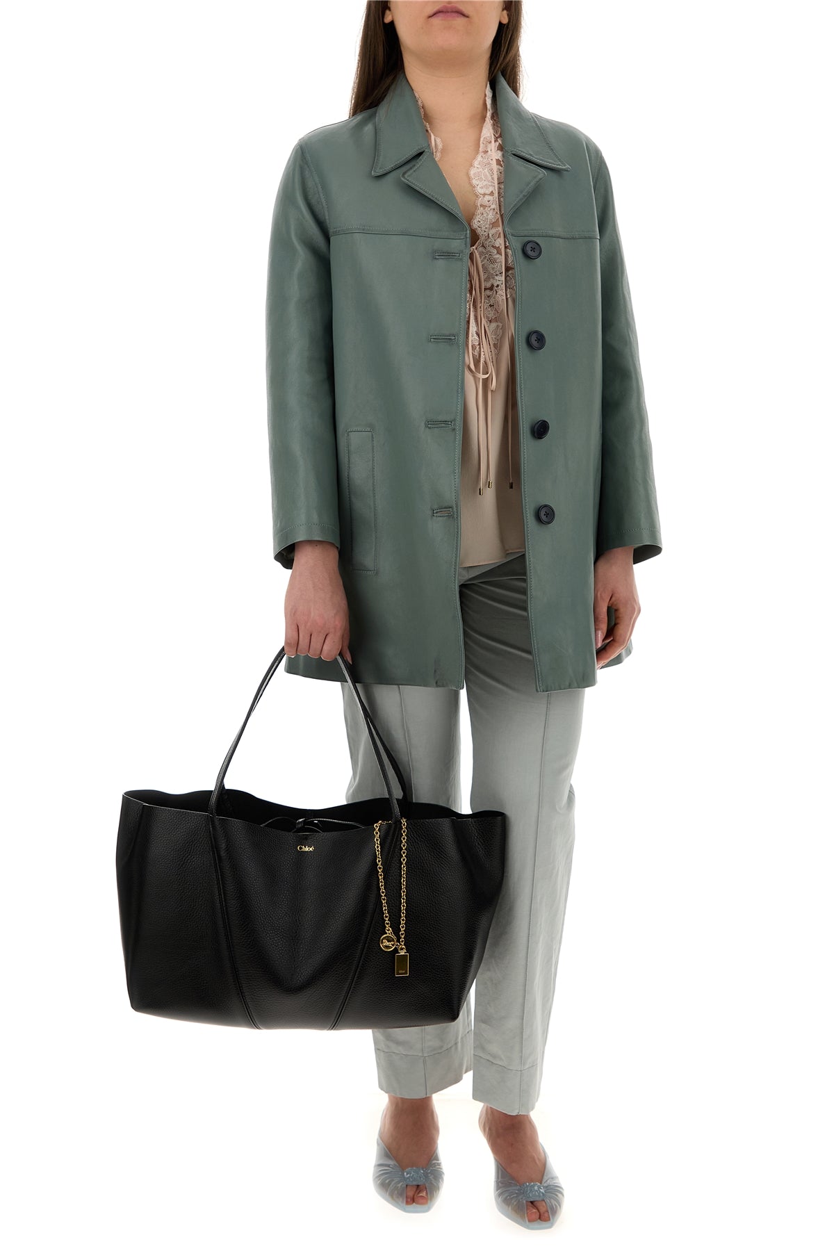 Shopping bag realized in calf pebble leather characterized by laminated printed logo at the front enriched by metal chain with charms.