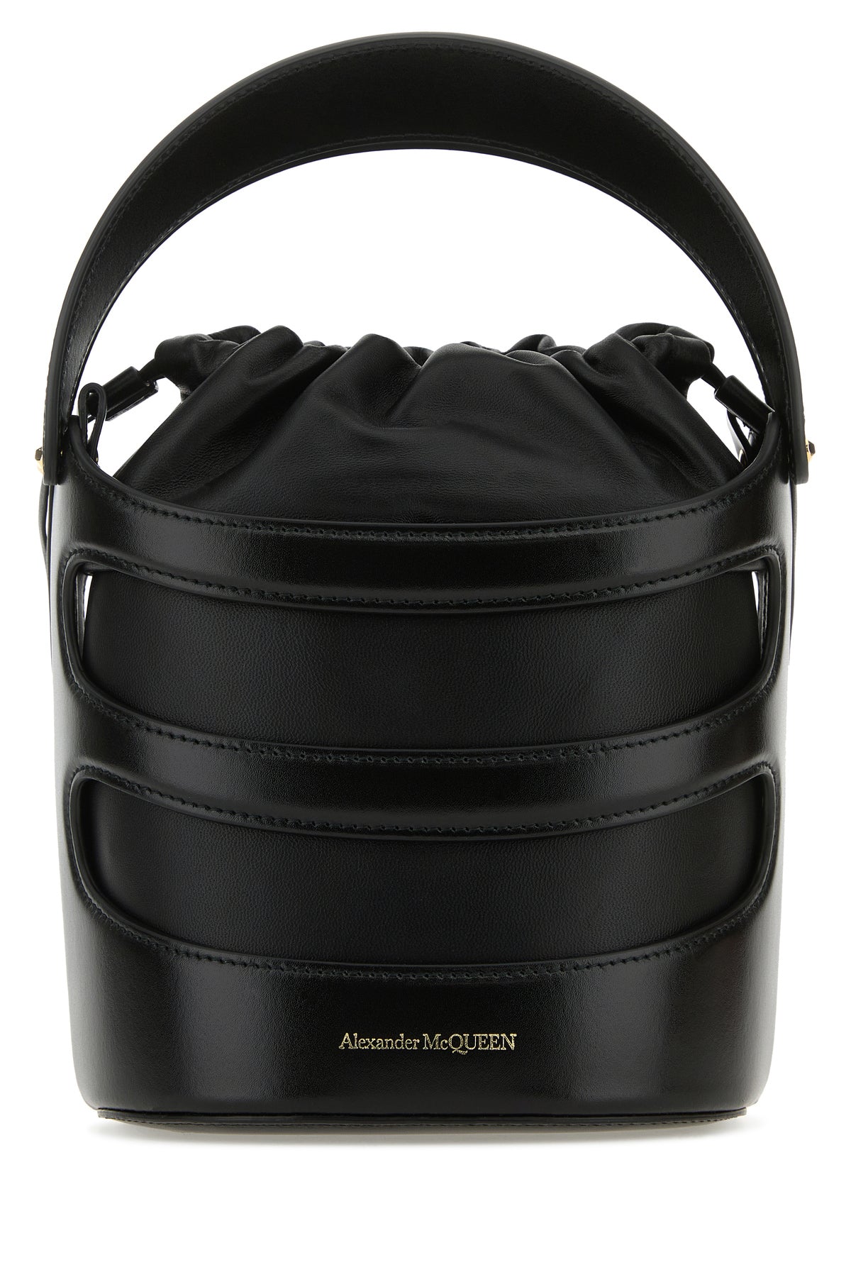 Bucket bag realized in smooth leather characterized by contrasting logoed print at the front and cut-out details at the front and at the back.