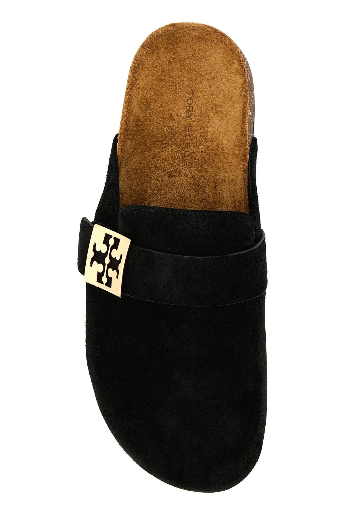 Slippers realized in suede enriched by metal logoed detail on the strap.