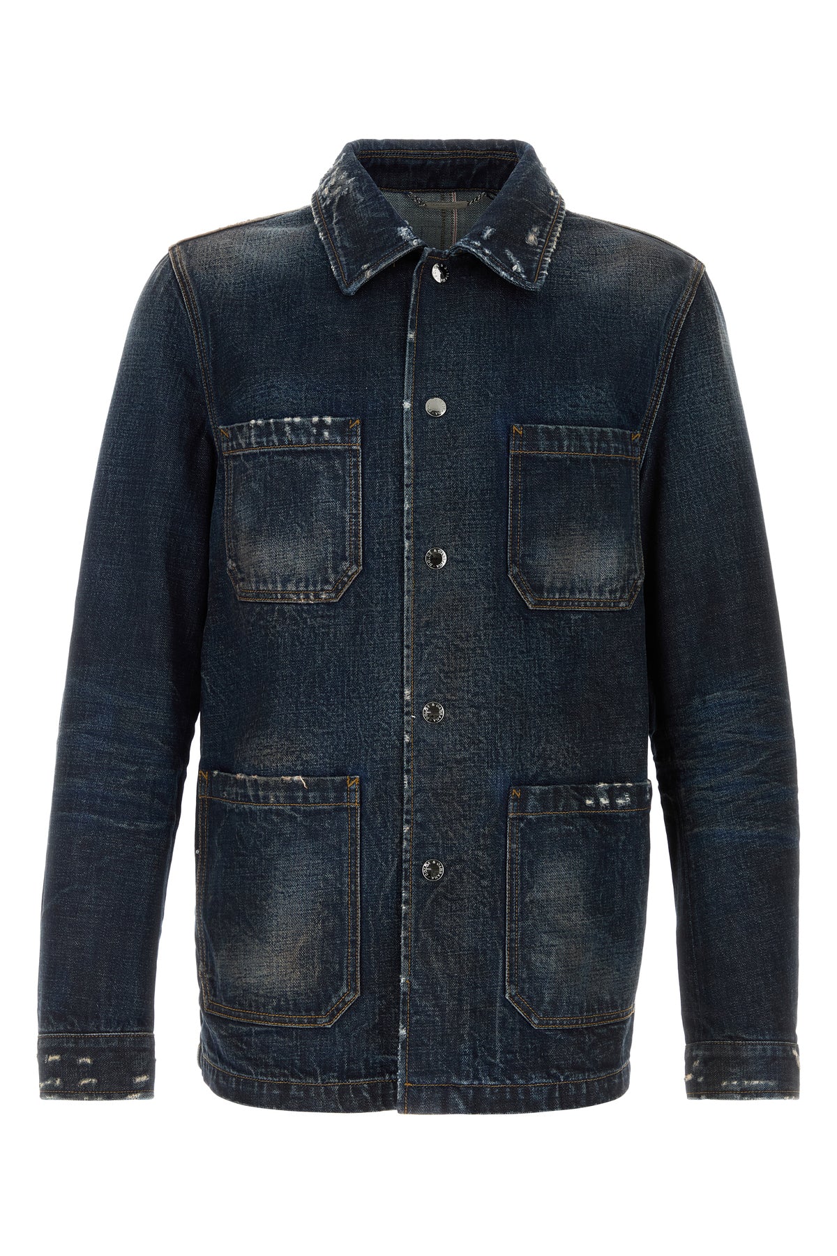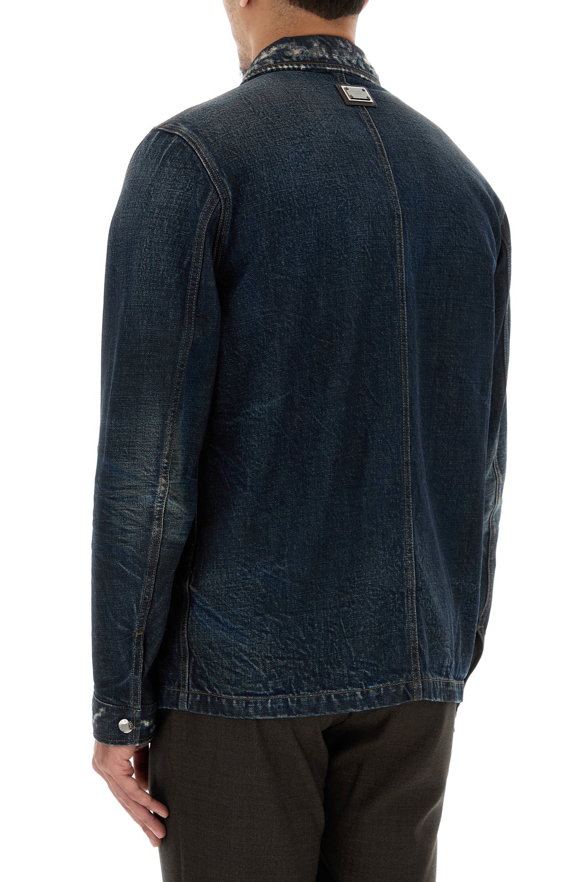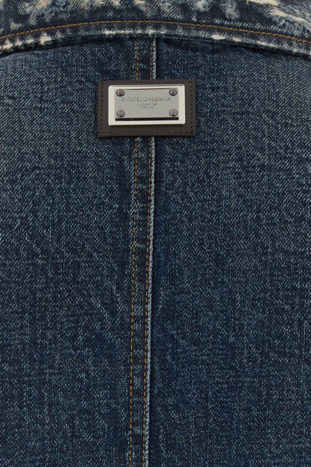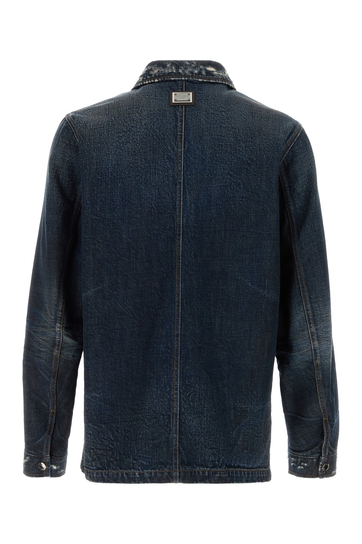 Jacket realized in vintage-effect distressed pure cotton denim enriched by metal logoed plate at the back.