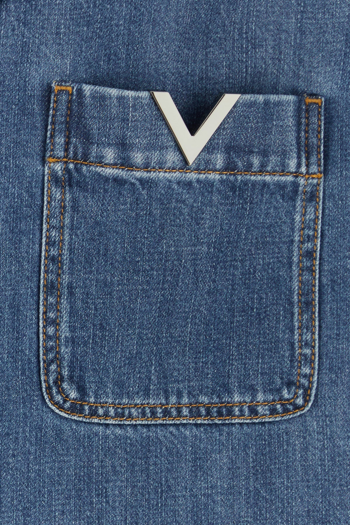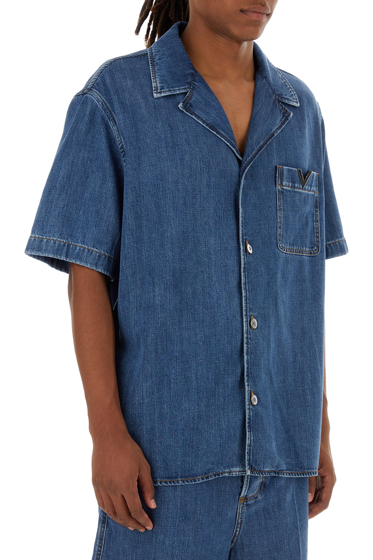 Short-sleeves shirt realized in denim enriched by V metal detail on the chest.