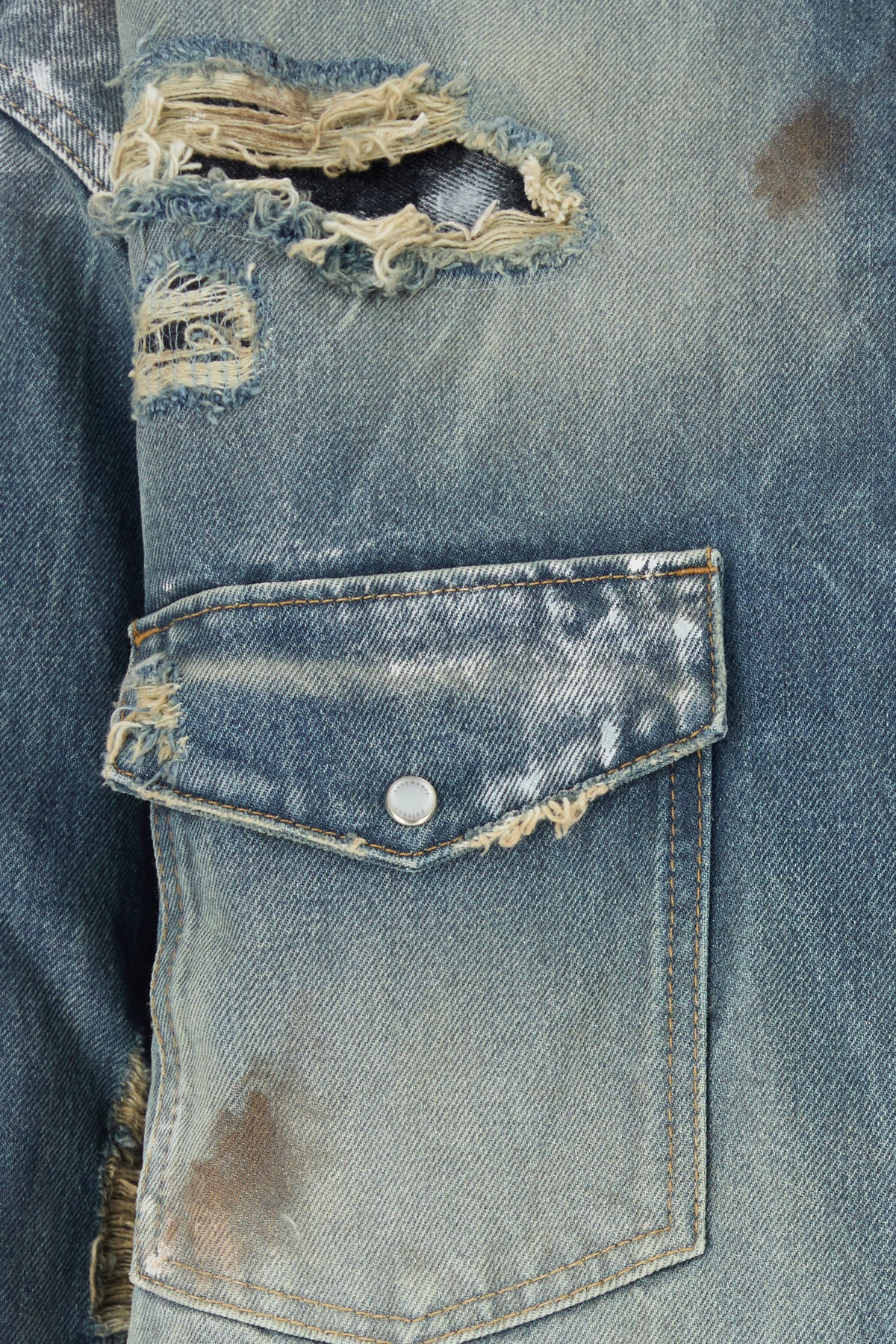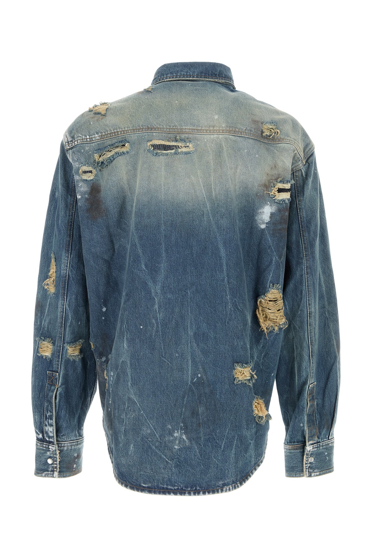 Shirt realized in stonewashed pure cotton denim characterized by repaired rips and intentional dirties.