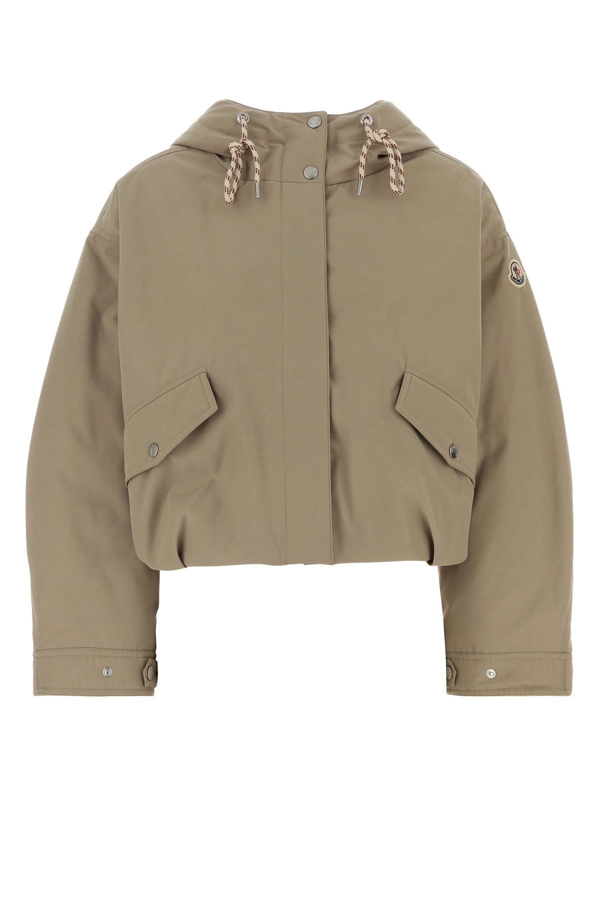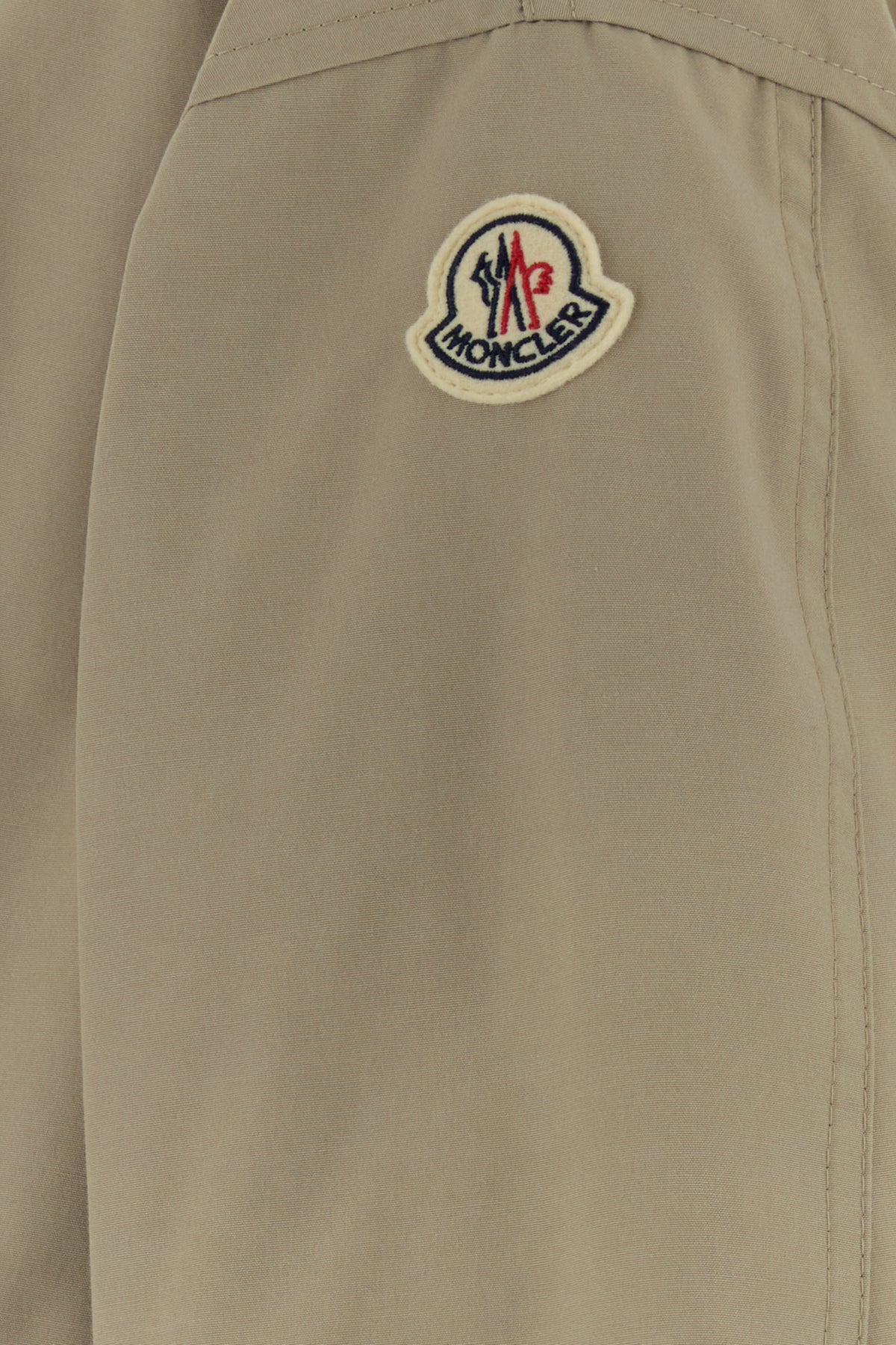 Short-cut down jacket realized in polyester and cotton enriched by contrasting logoed patch on the sleeve.