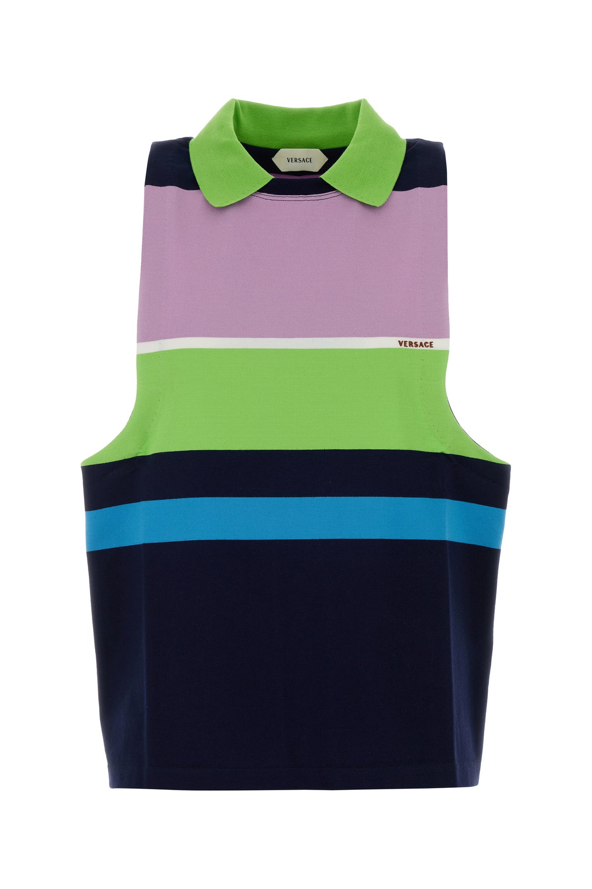 Sleeveless polo shirt realized in pure cotton characterized by striped embroidery on the entire surface and embroidered logo on the chest.