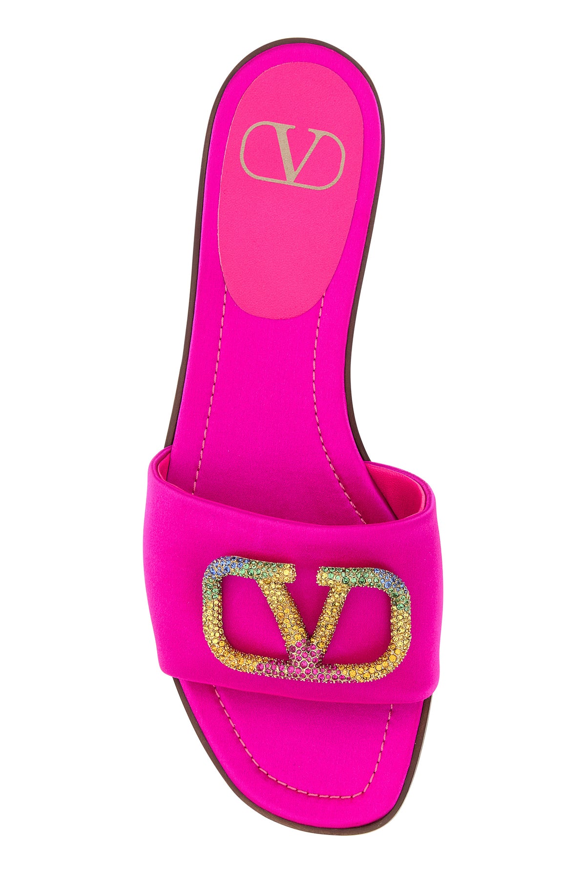 Slippers realized in satin enriched by VLogo detail with rhinestones at the front.