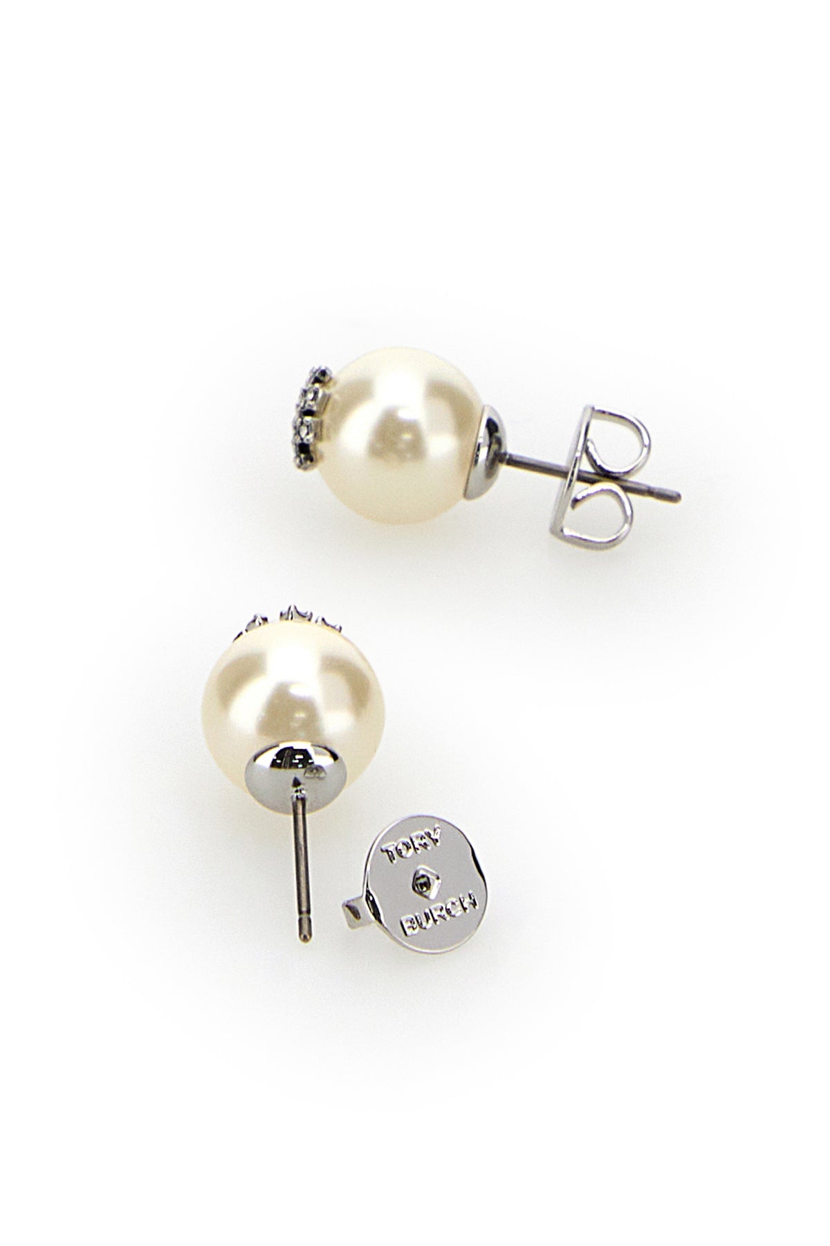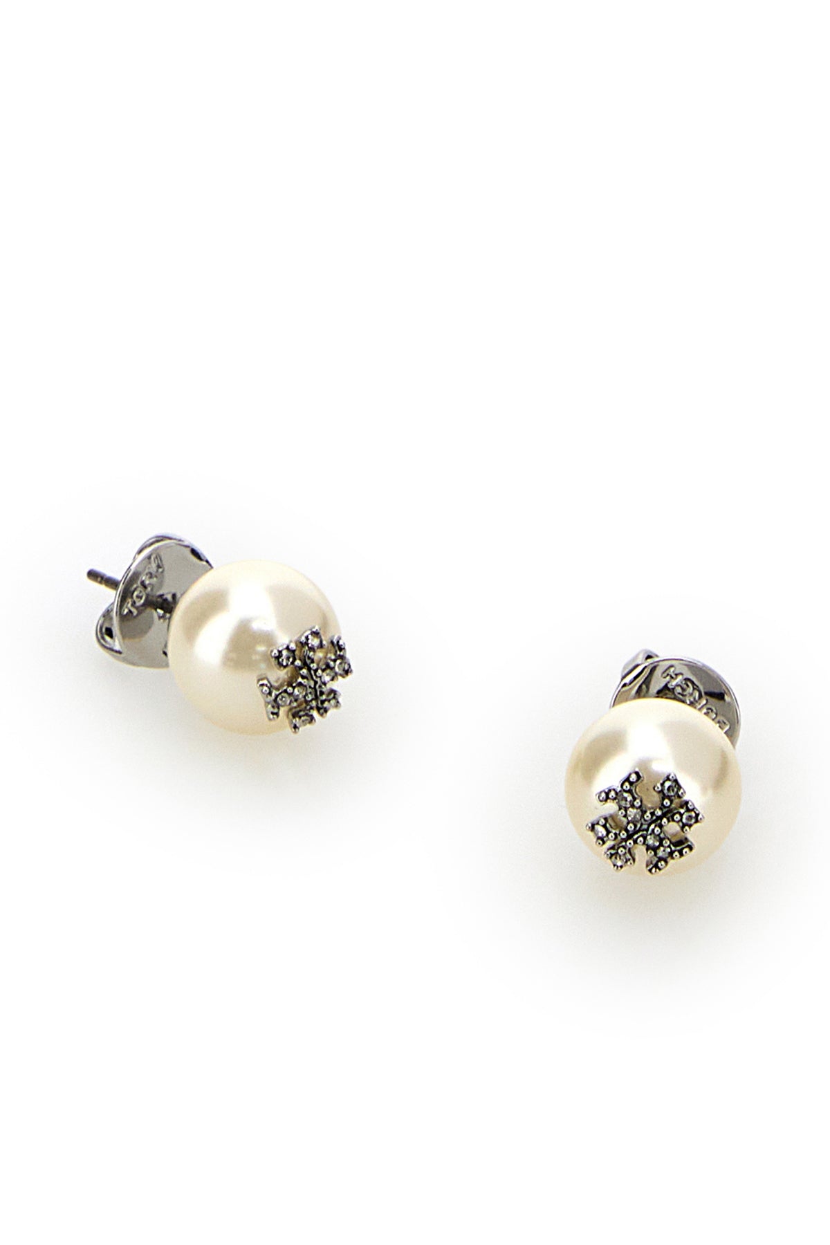 Earrings realized in pearls enriched by metal logoed detail with rhinestones at the front.