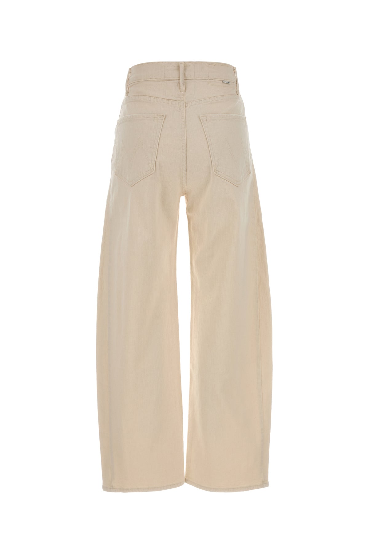 Wide-leg jeans realized in stretch cotton denim enriched by logoed label at the back.