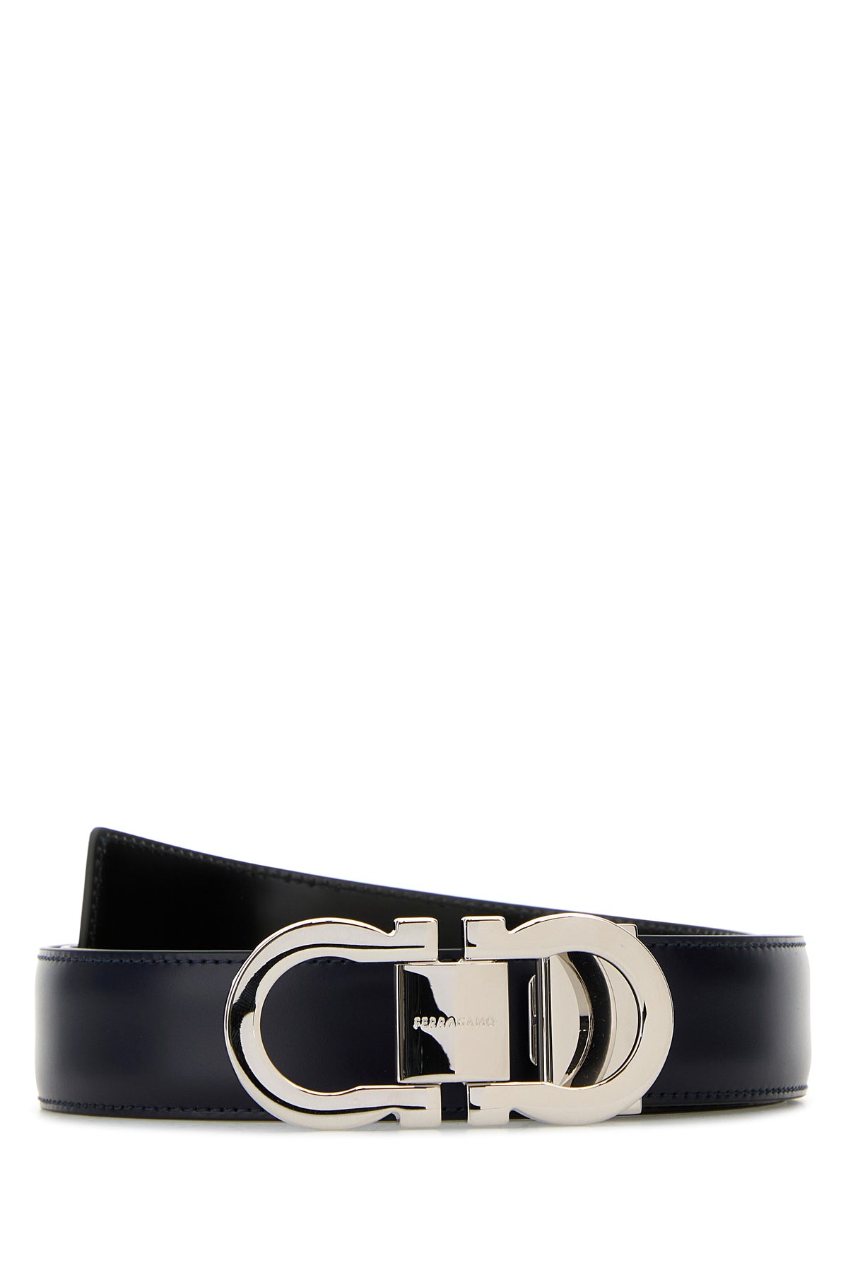 Belt realized in smooth calf leather characterized by metal Gancini motif buckle.