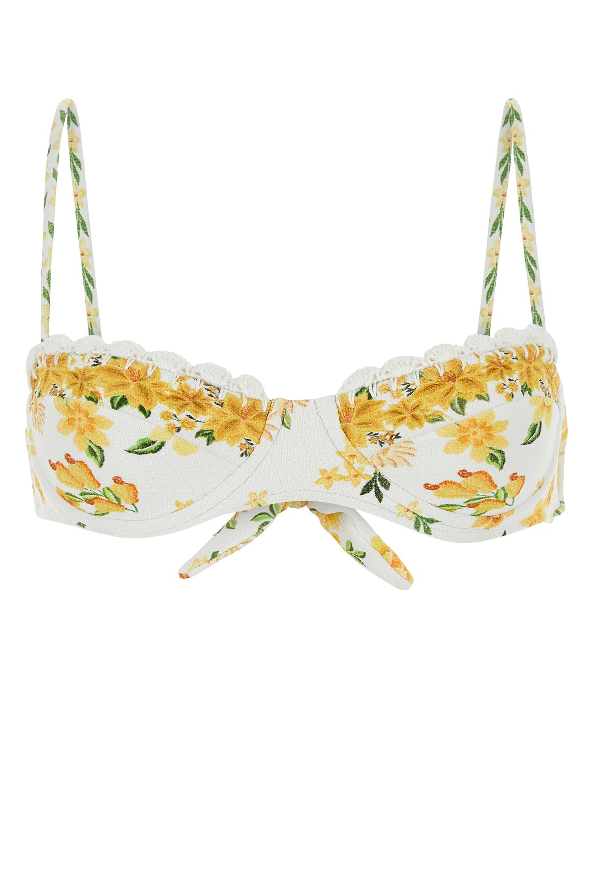 Balcony bikini top realized in stretch nylon characterized by floral print on the entire surface.