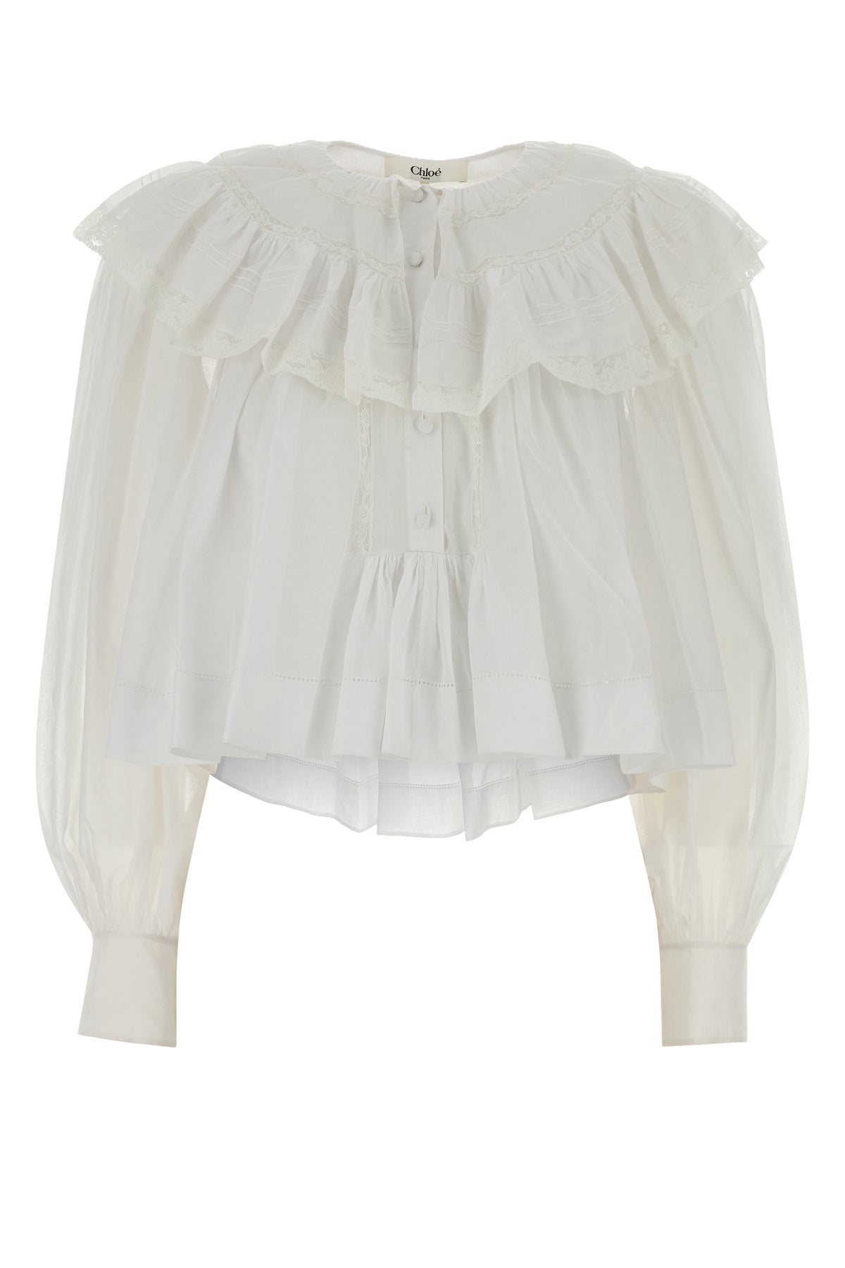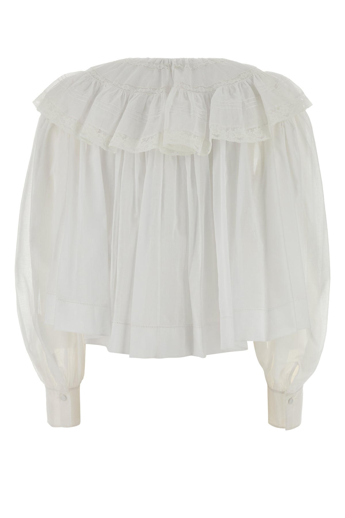 Blouse realized in pure cotton with tonal lace inserts enriched by flounces.