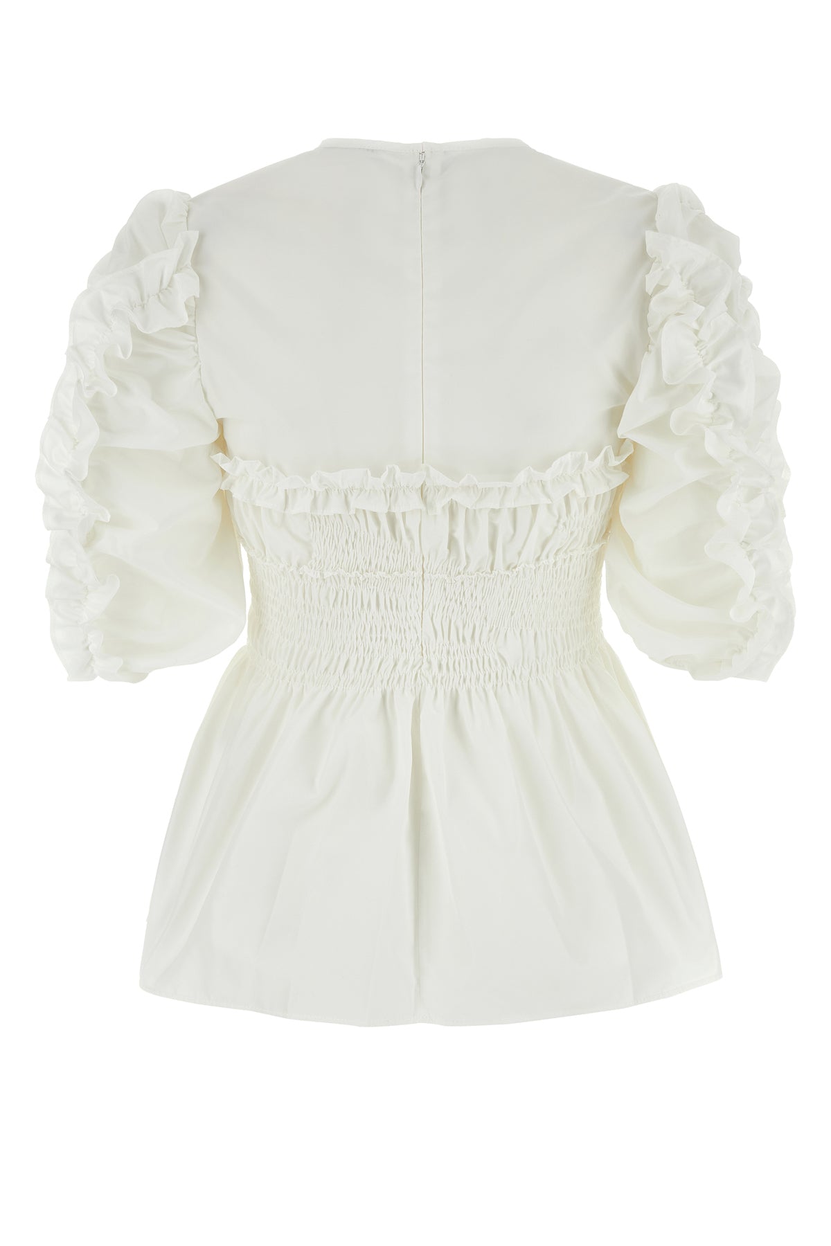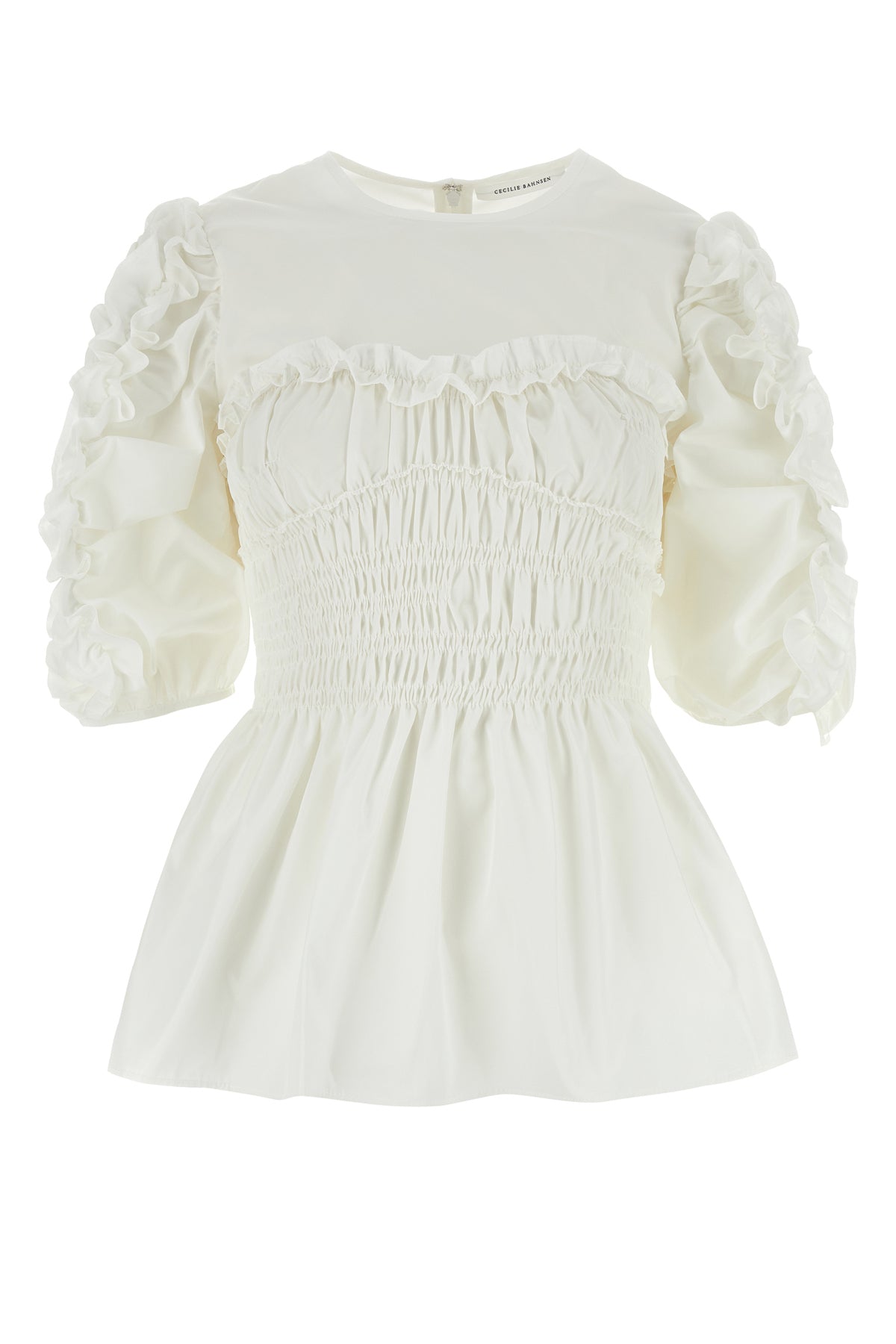 Top realized in polyester characterized by gatherings on the sleeves, at the front and at the back.