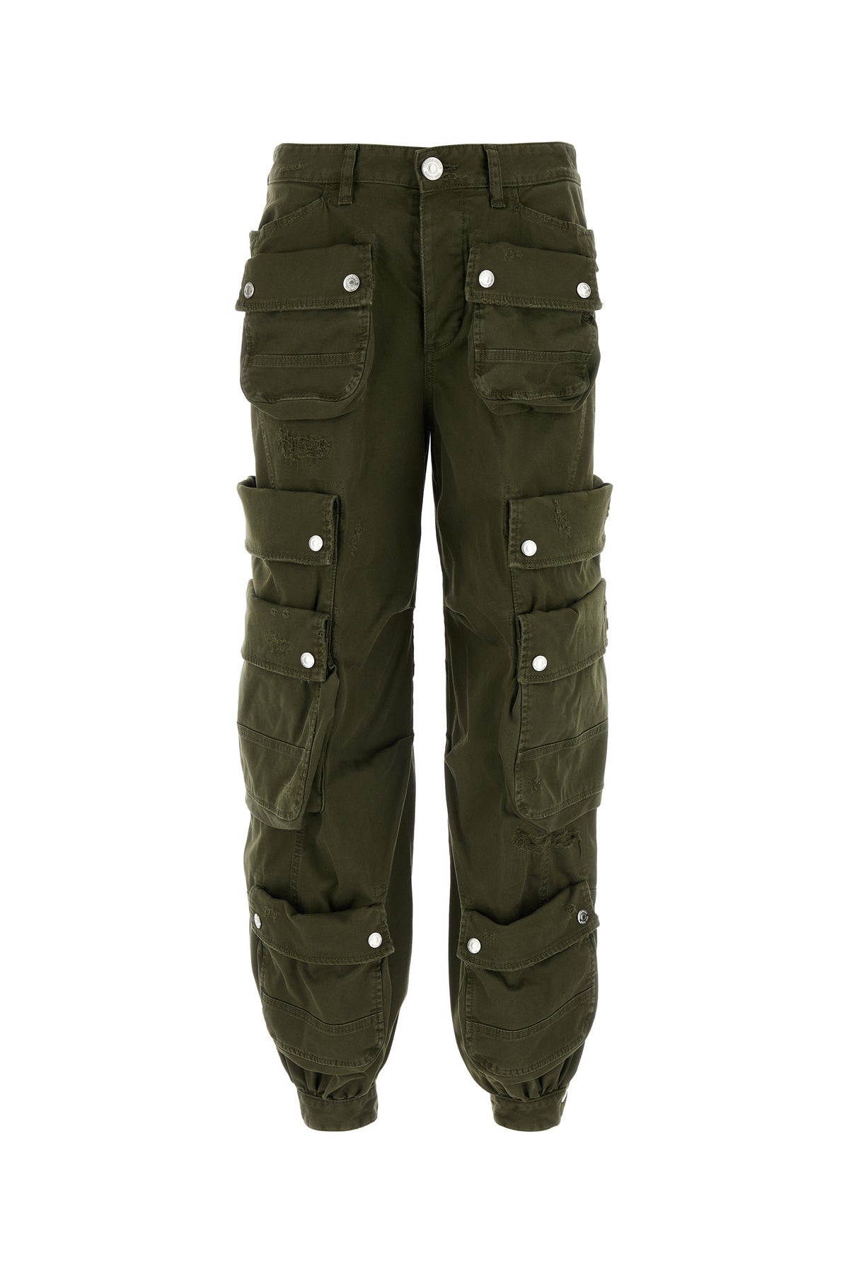 Cargo pant realized in distressed effect stretch cotton characterized by peculiar contrasting print on the side.