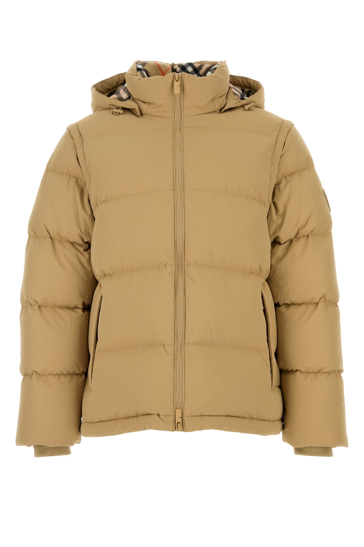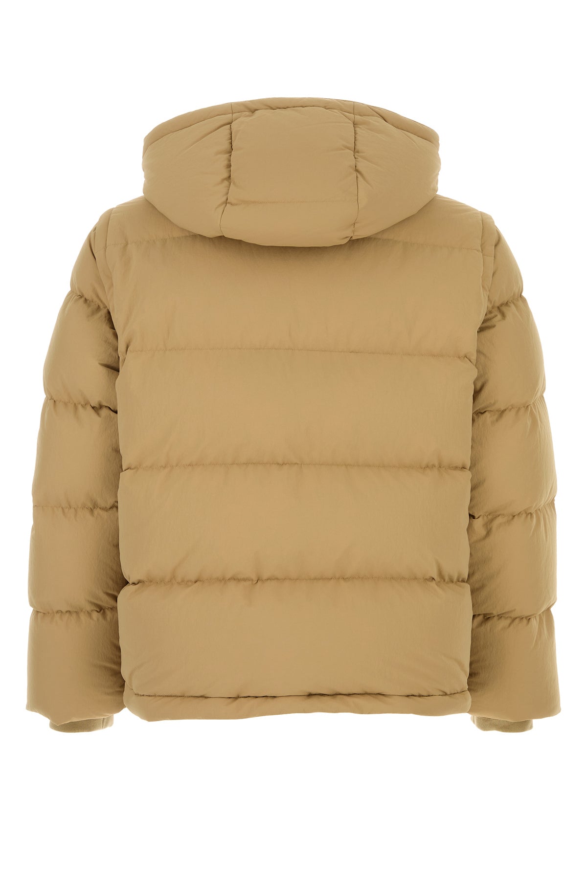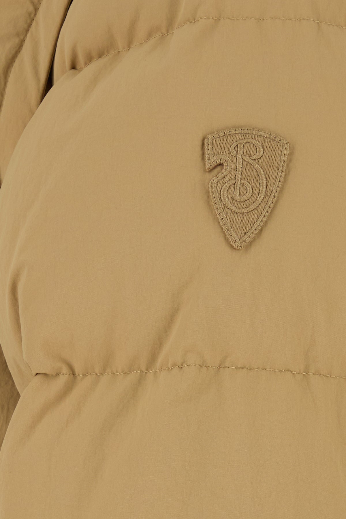 Padded jacket realized in creased-effect quilted nylon enriched by tonal logoed patch on the sleeve.