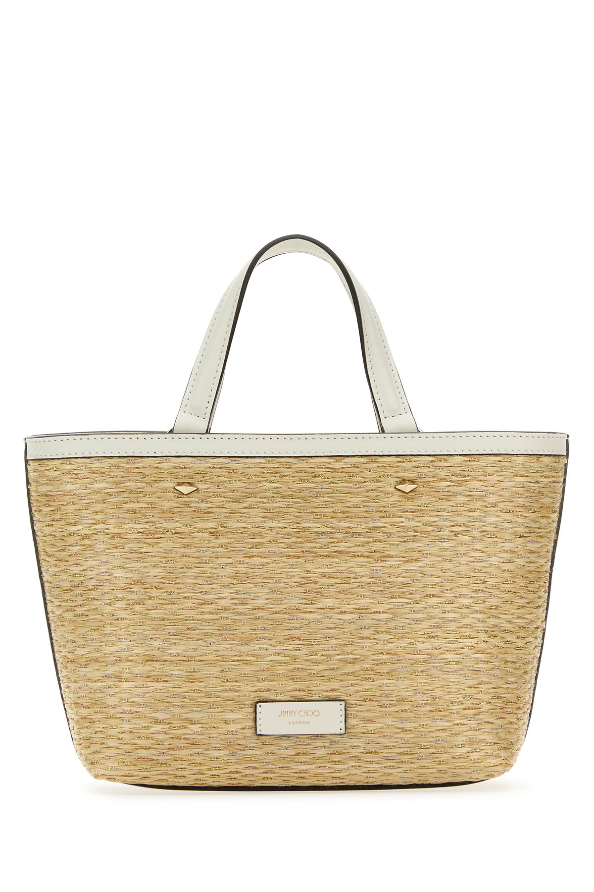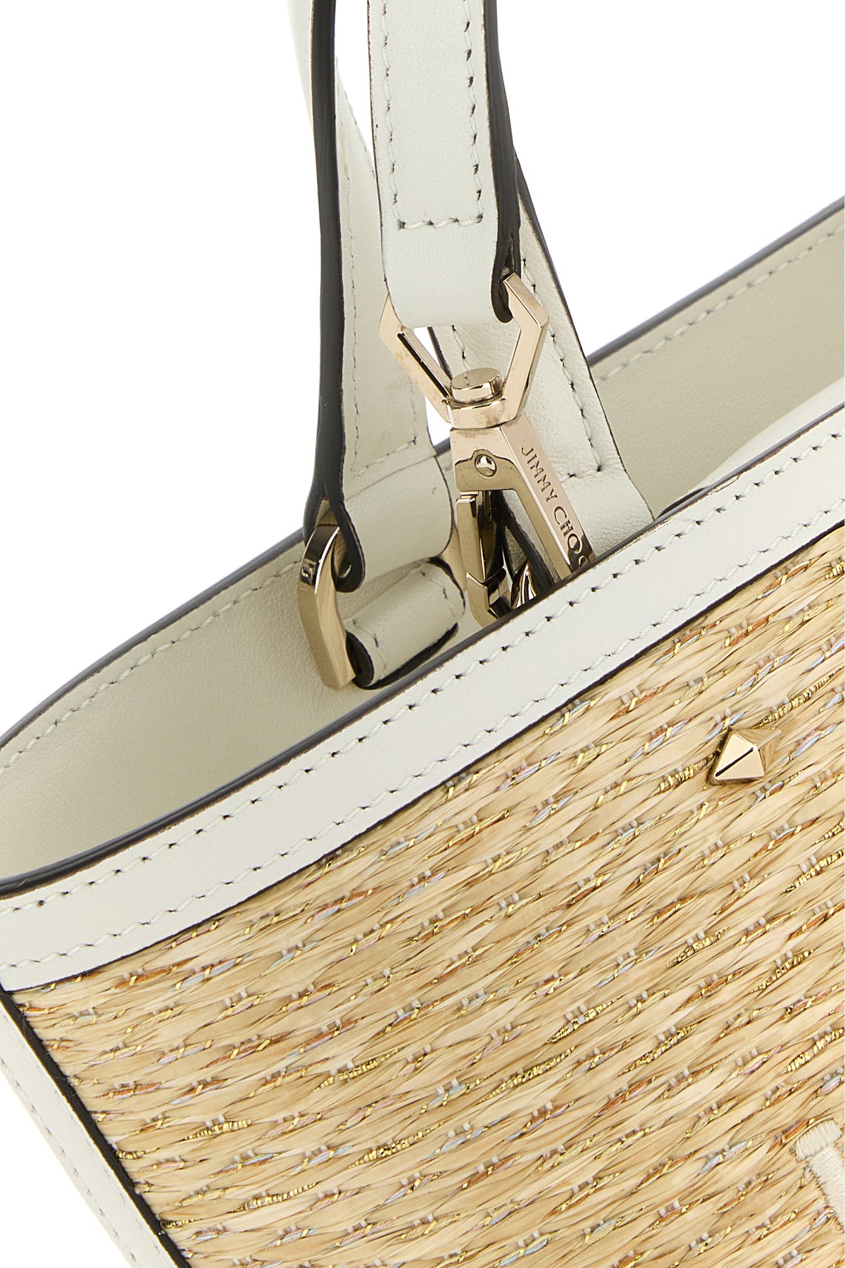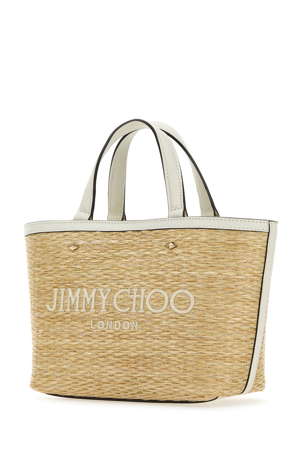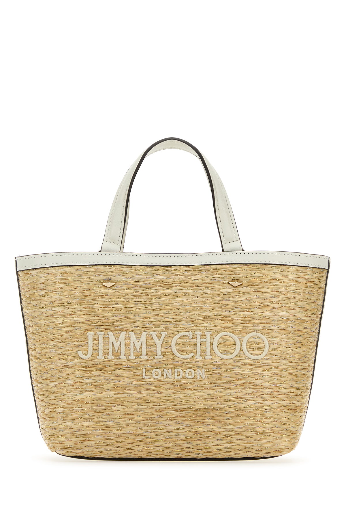 Handbag realized in raffia with leather inserts on the trimmings characterized by contrasting embroidered logo at the front enriched by contrasting logoed label at the back.