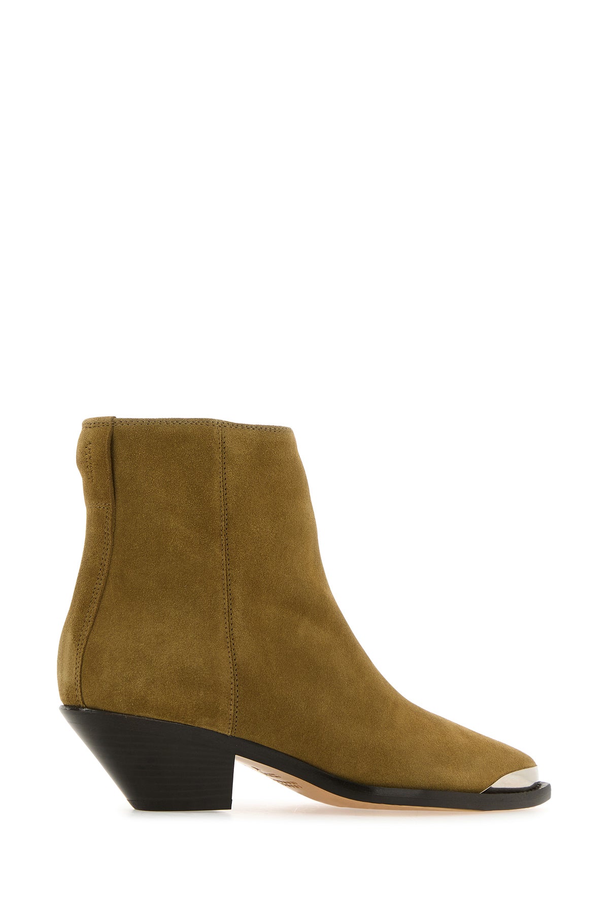 Ankle boots realized in calf suede enriched by metal detail on the toe.