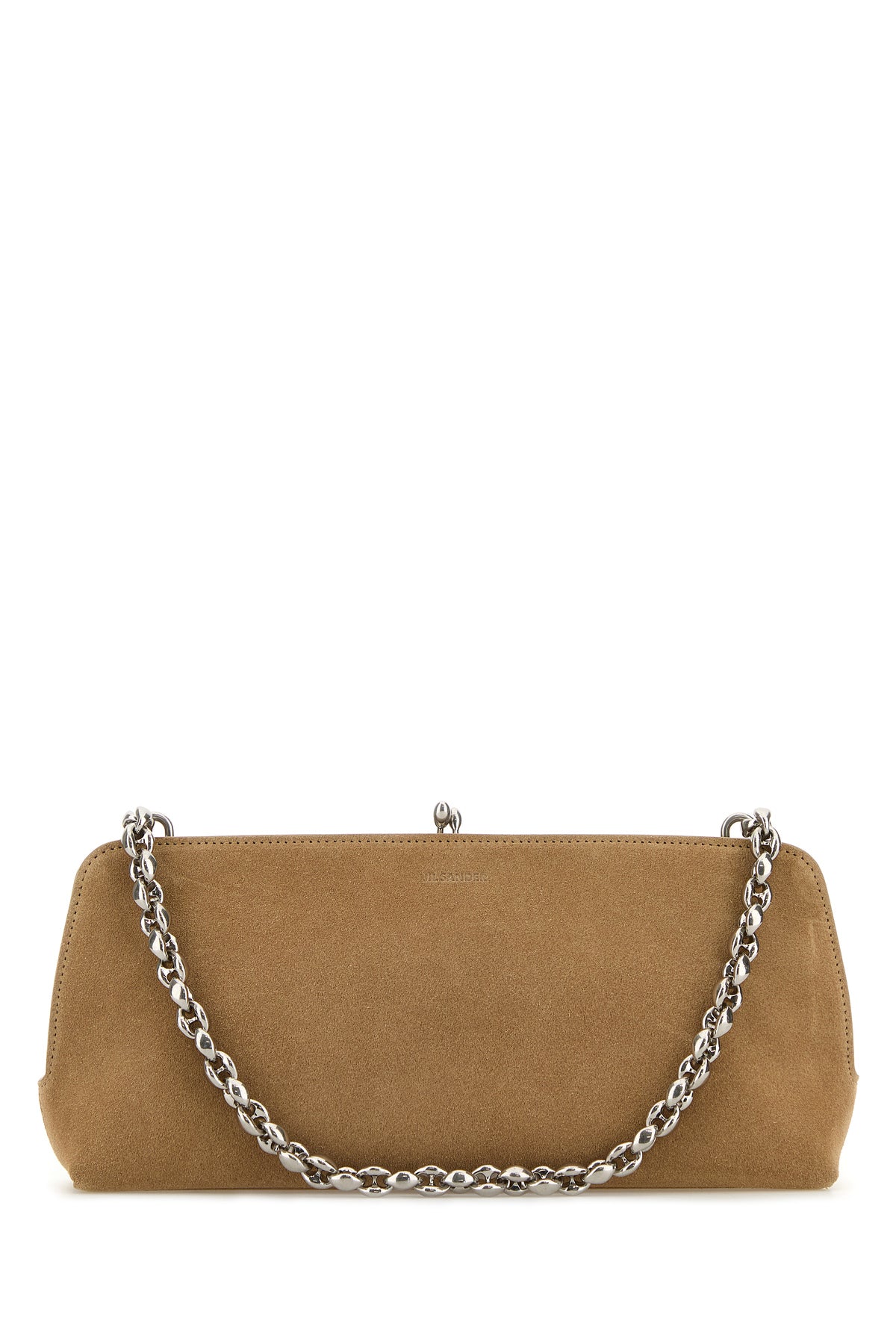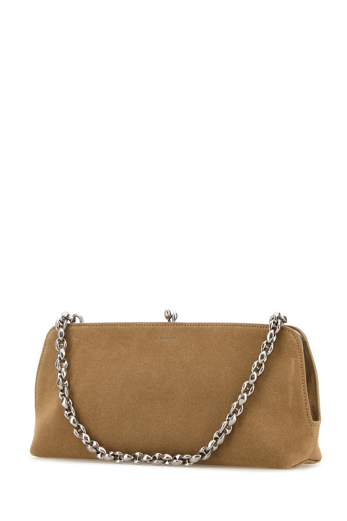 shoulder bag realized in suede characterized by embossed logo at the front.