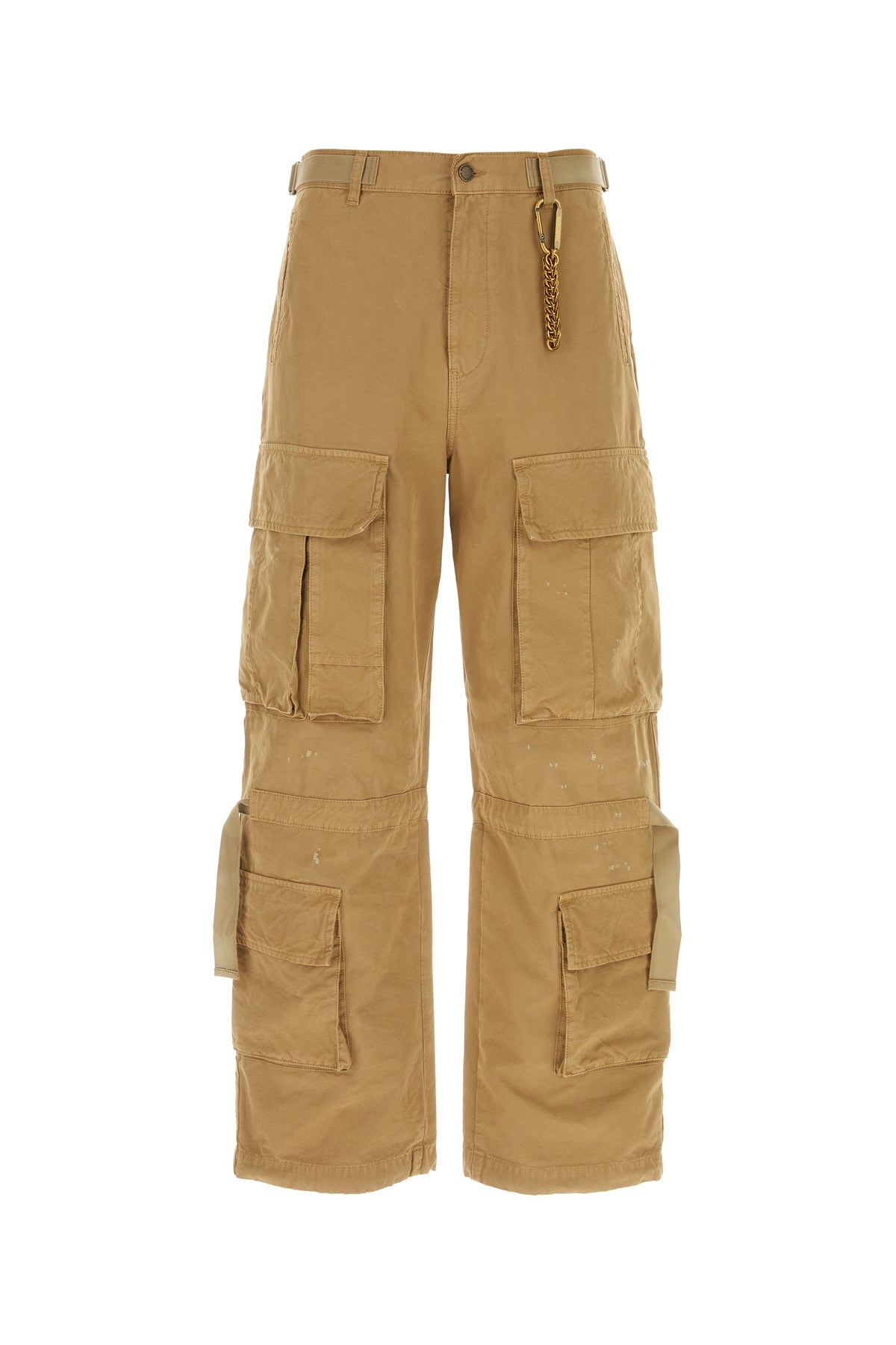 Pant realized in pure cotton characterized by adjustable straps at the front and at the back enriched by detachable metal chain.