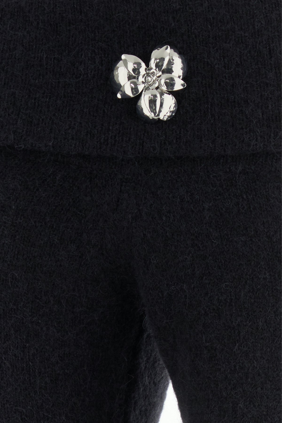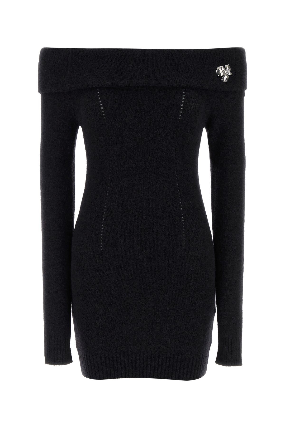 Off-the-shoulder mini dress realized in alpaca blend enriched by metal floral detail at the top.