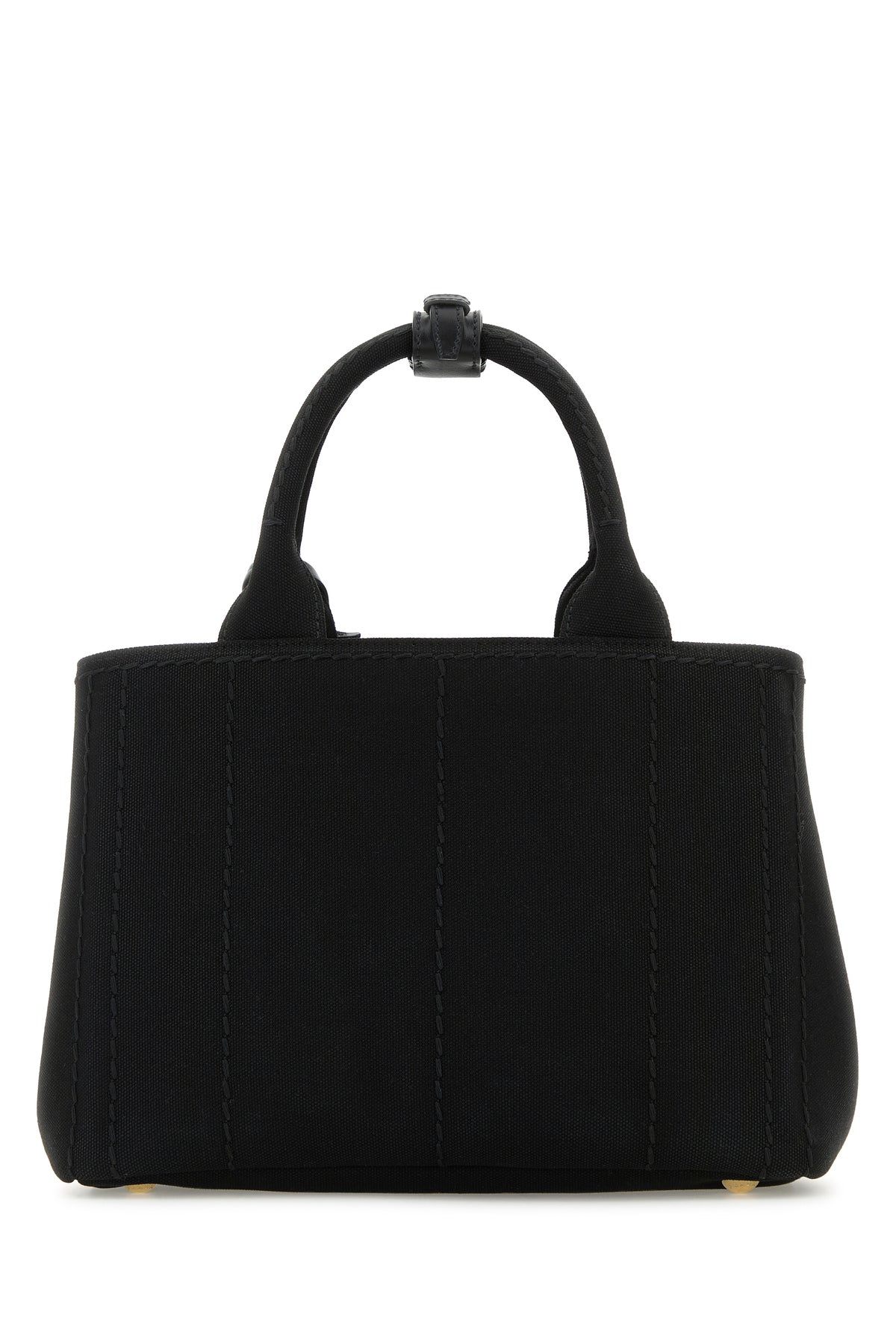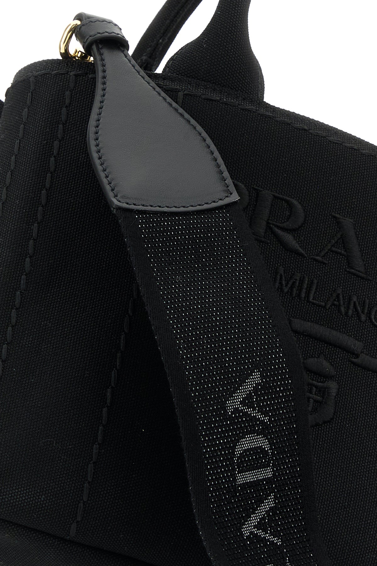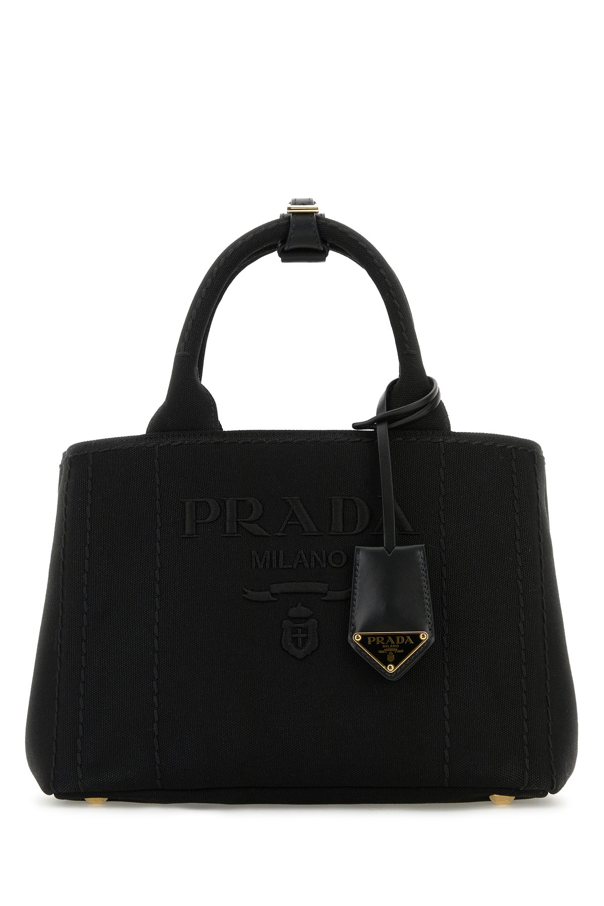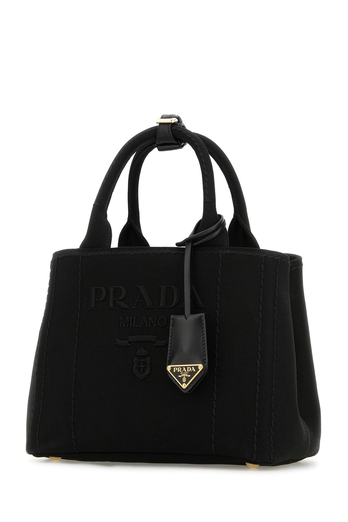 Shopping bag realized in canvas characterized by tonal embroidered logo at the front enriched by charm with iconic logoed metal triangle at the front.