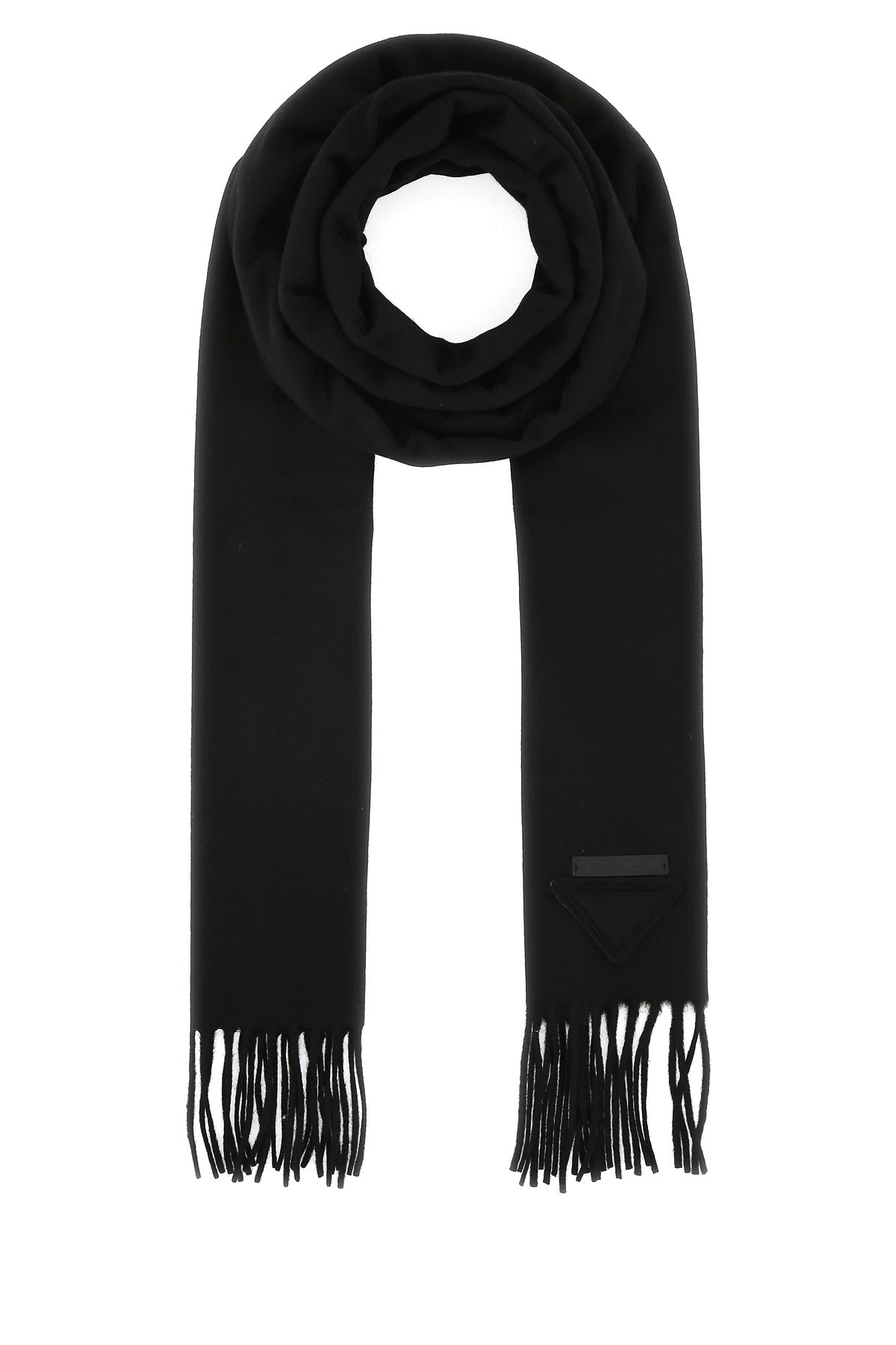 Scarf realized in pure cashmere enriched by iconic tonal triangle and logoed label on the hemline.