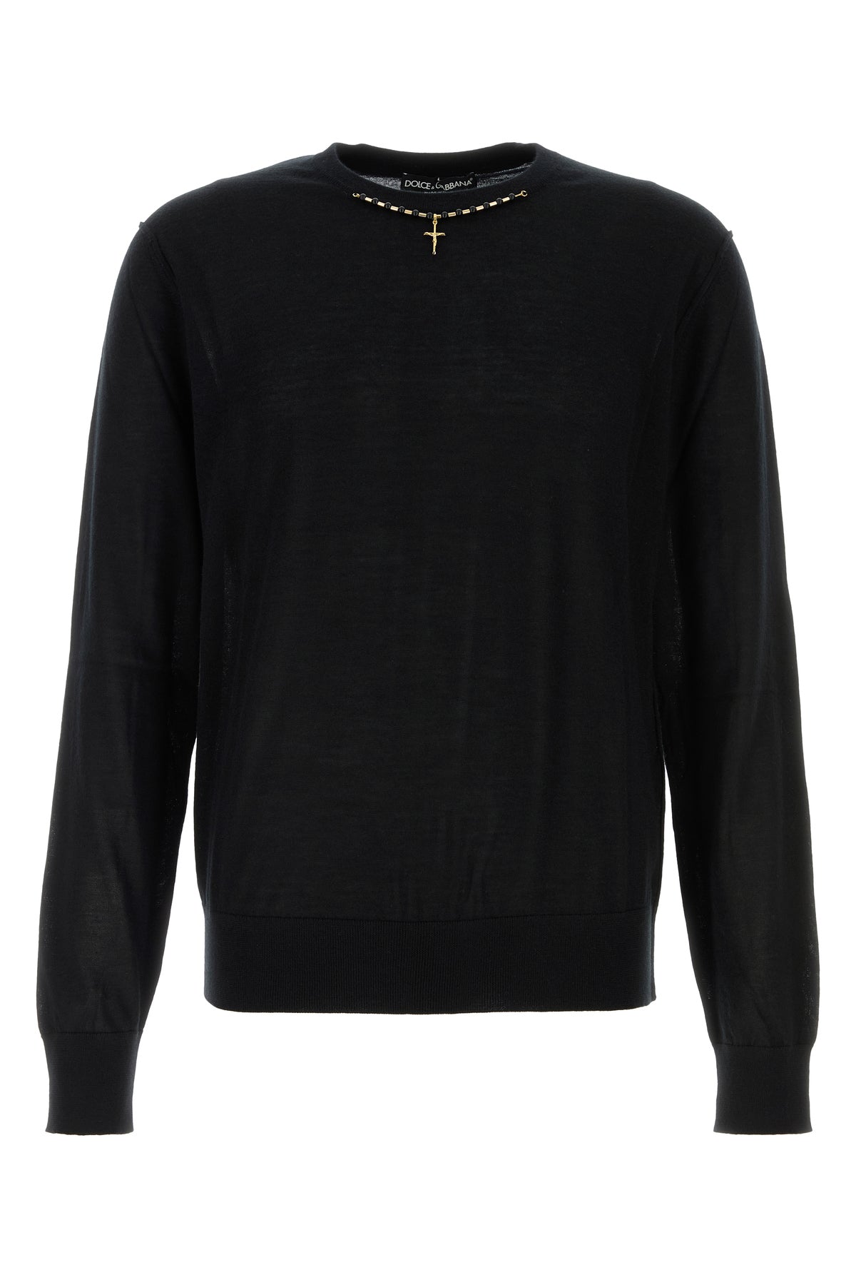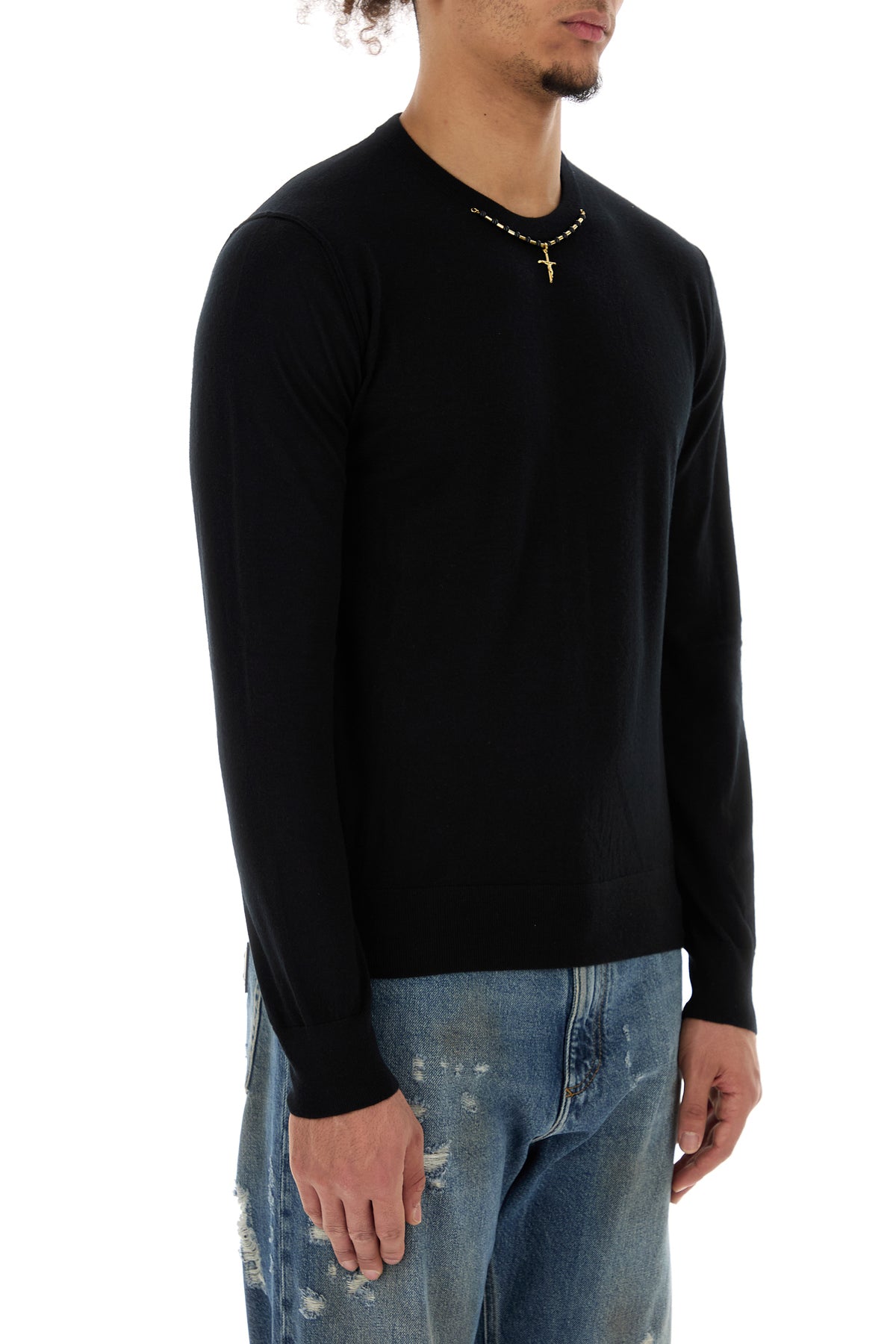 Sweater realized in pure cashmere enriched by peculiar metal embellishment at the front.