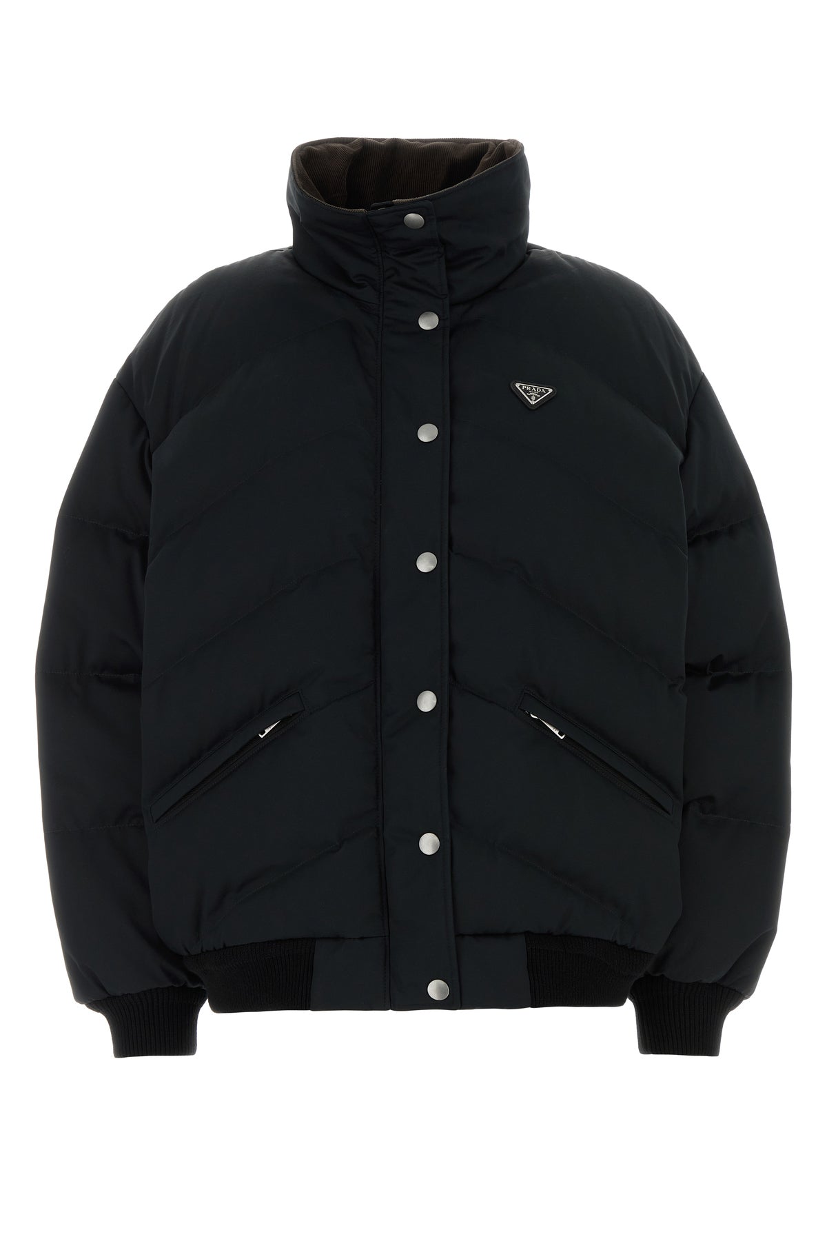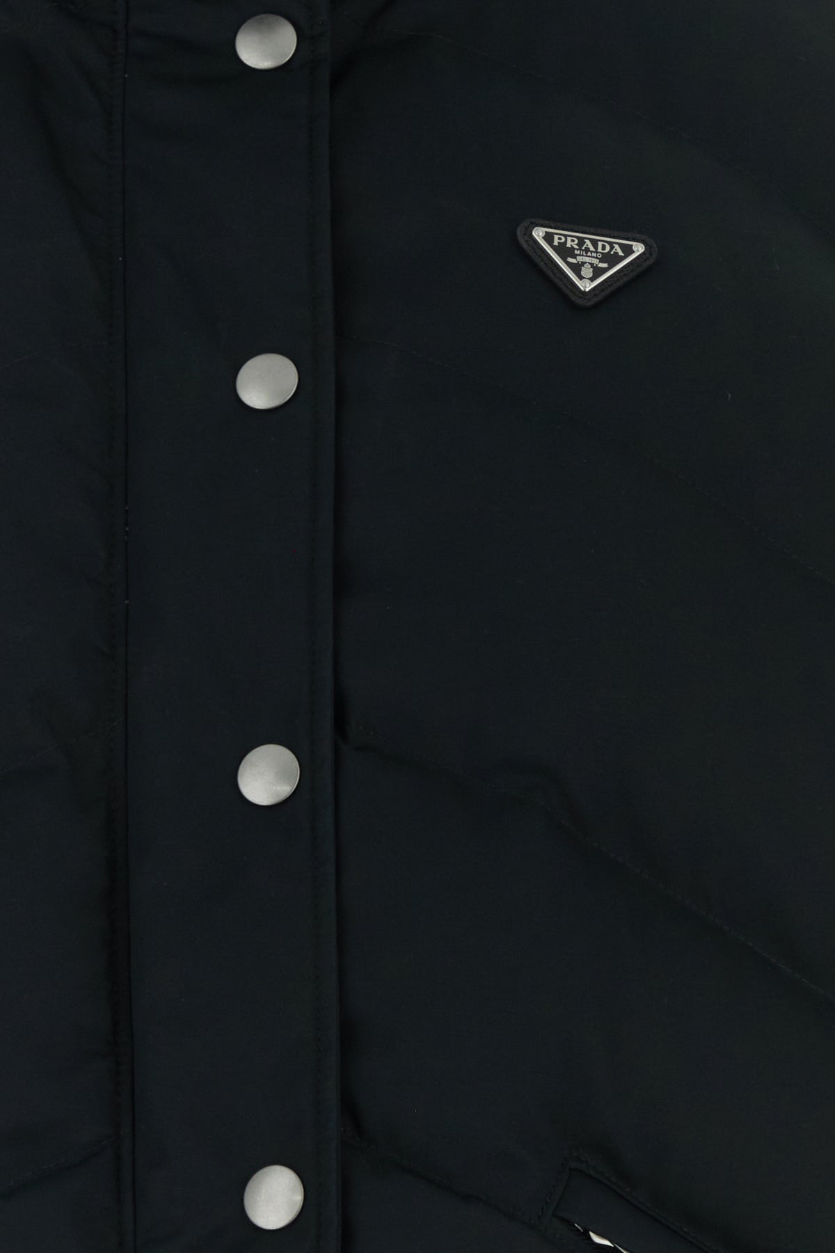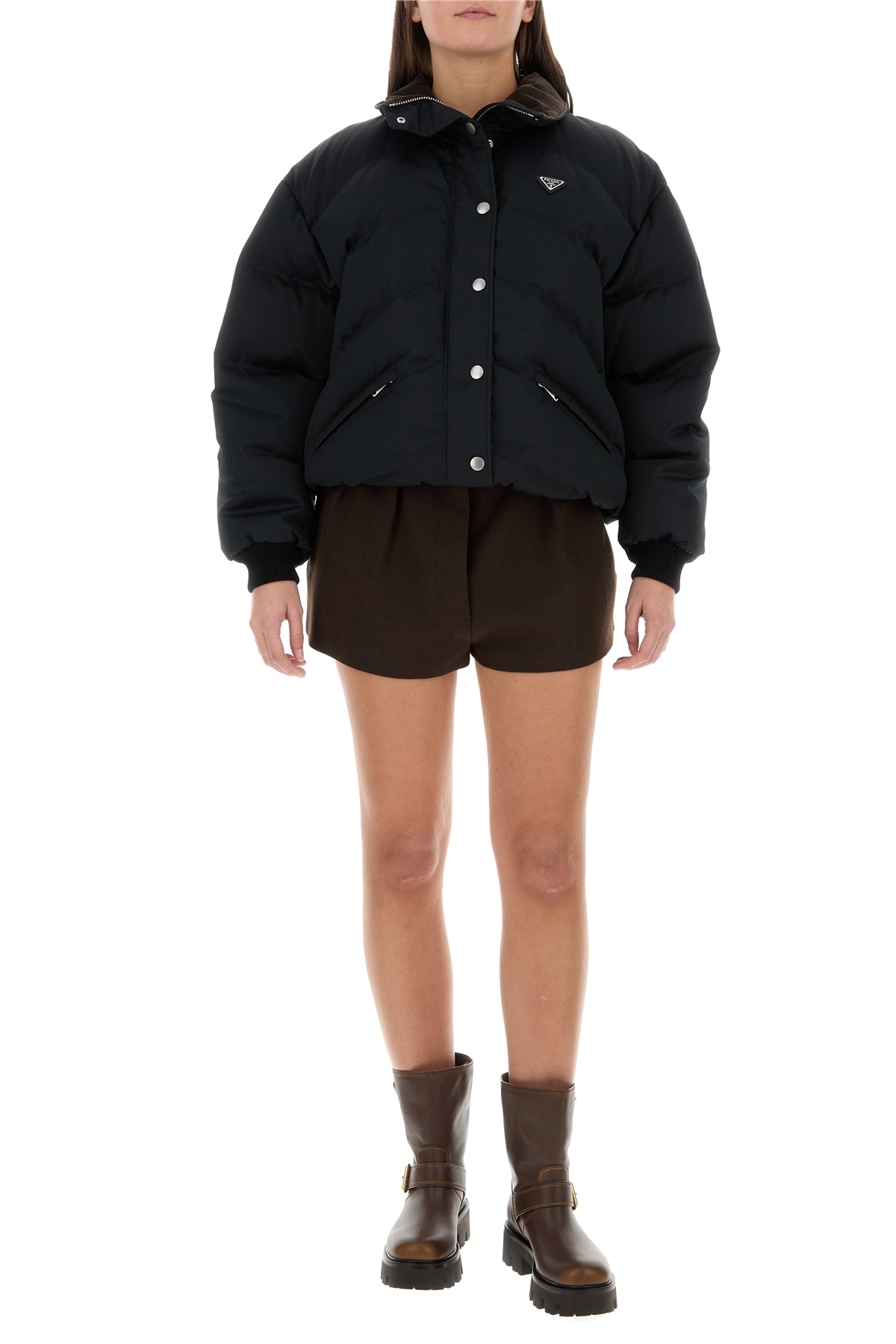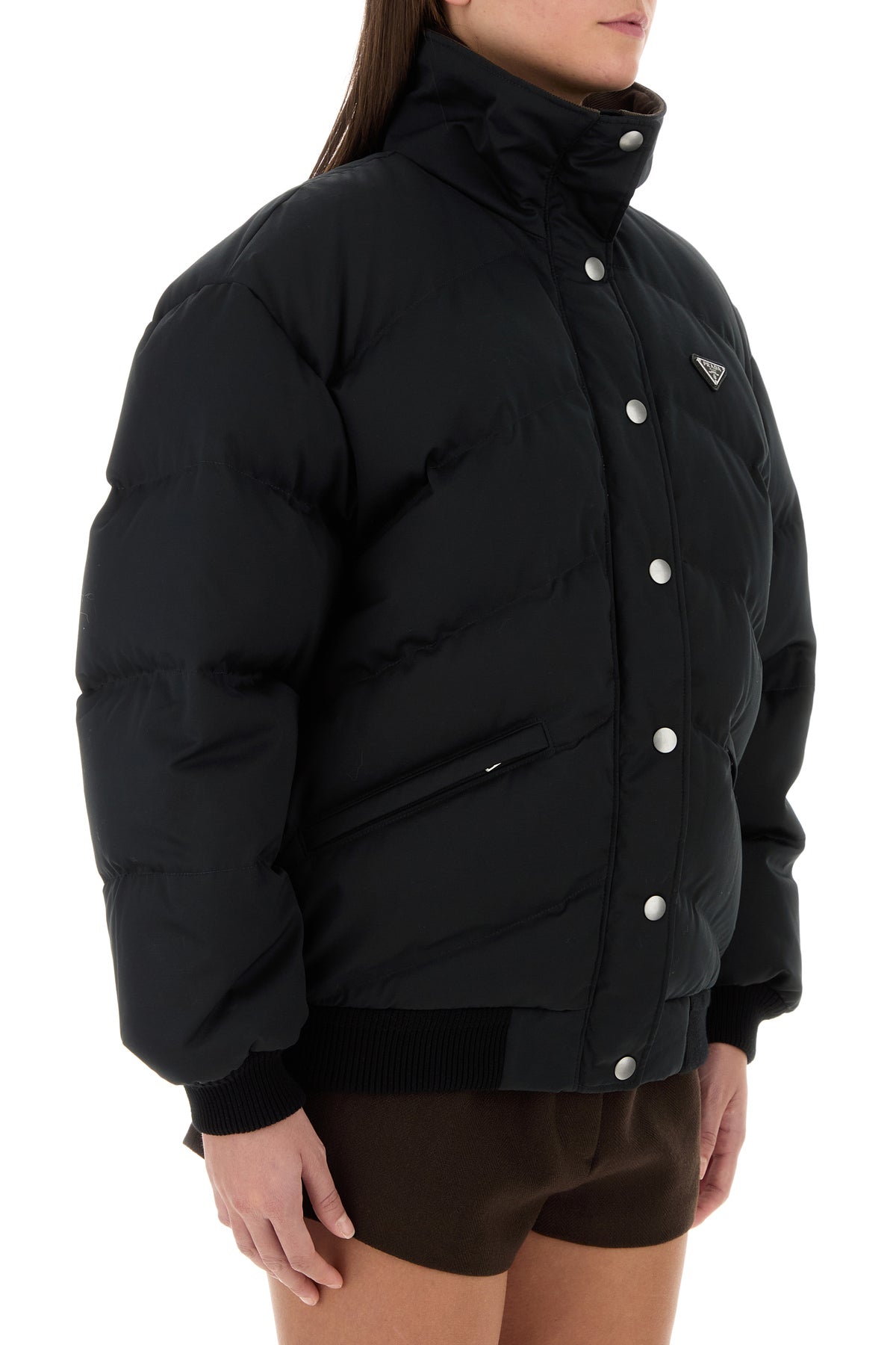 Down jacket realized in cotton and silk enriched by iconic logoed metal triangle on the chest.