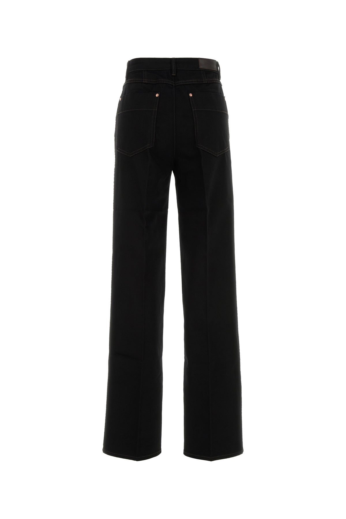 High waist jeans realized in pure cotton denim enriched by leather logoed label at the back.