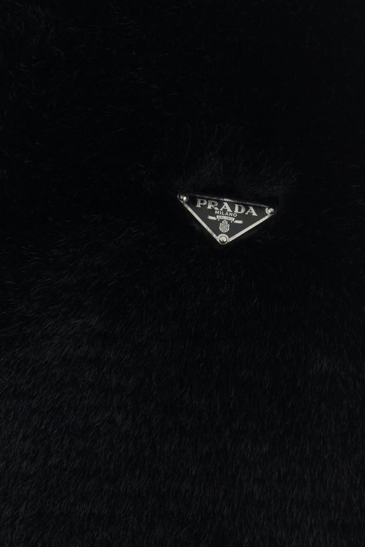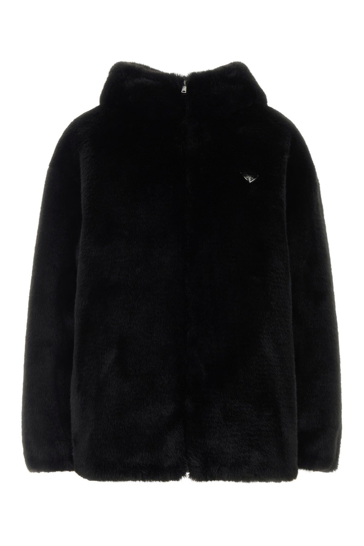 Reversible jacket realized in eco fur enriched by iconic logoed metal triangle on the chest.