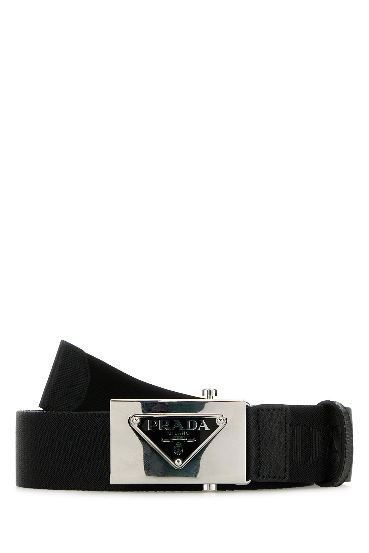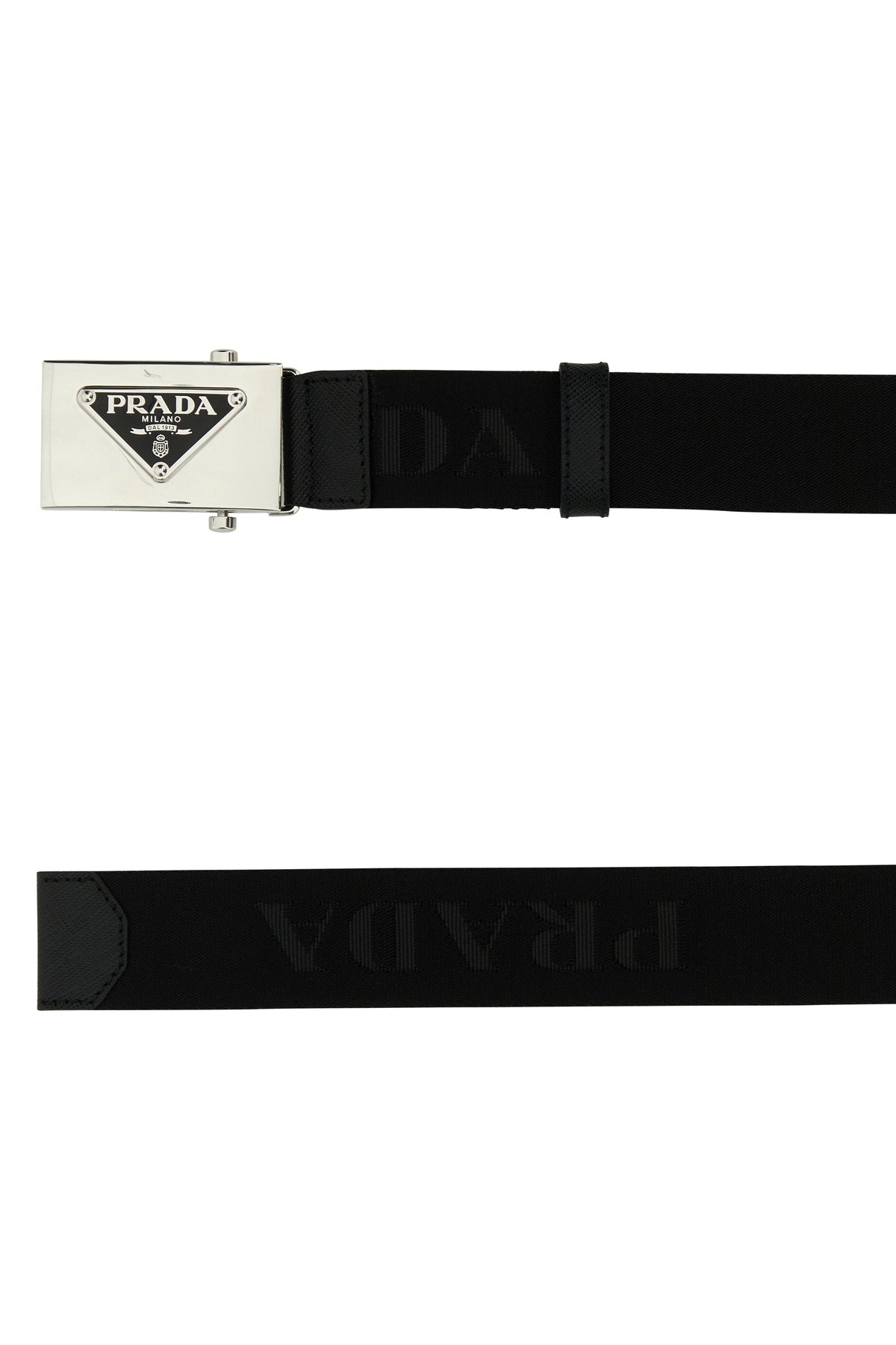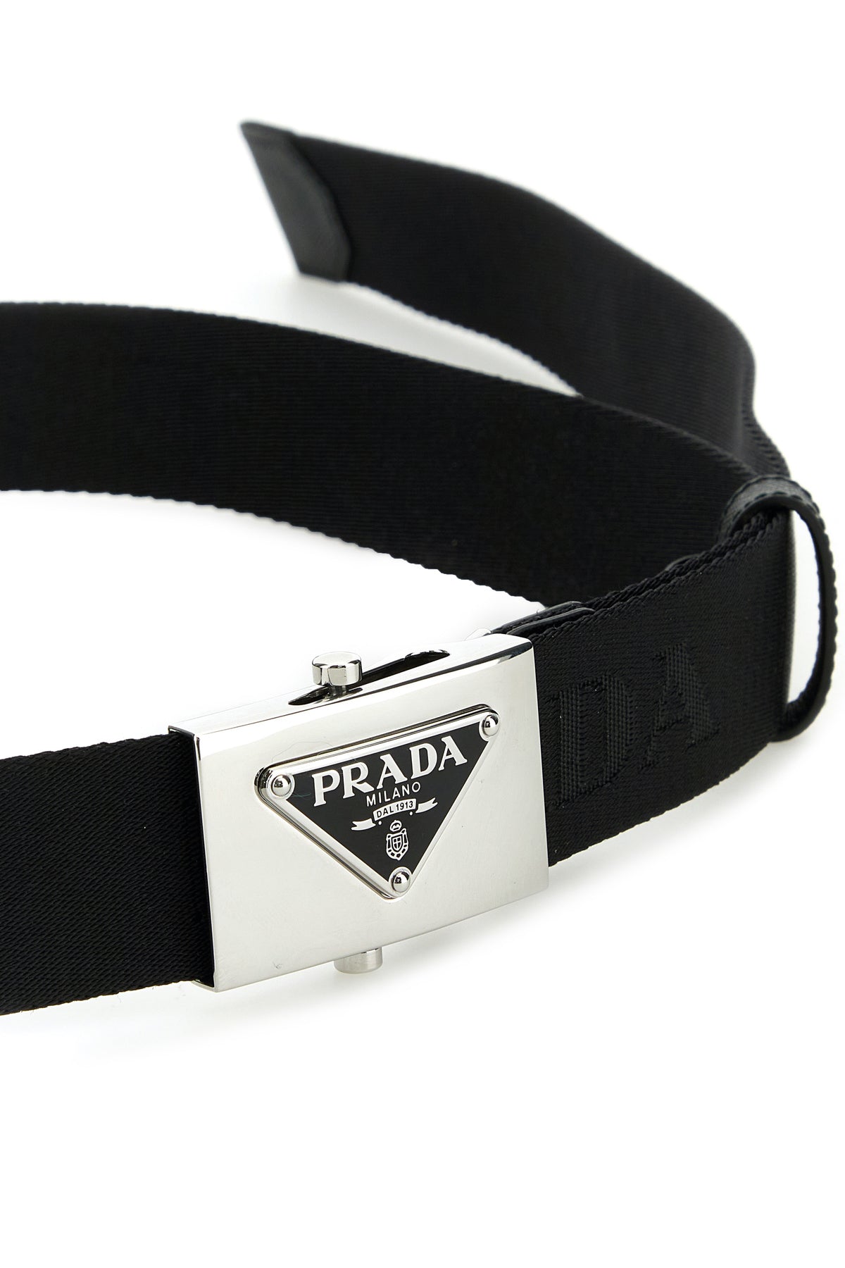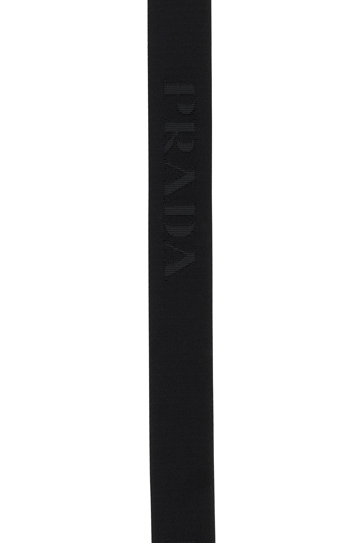 Belt realized in fabric characterized by logoed metal buckle.