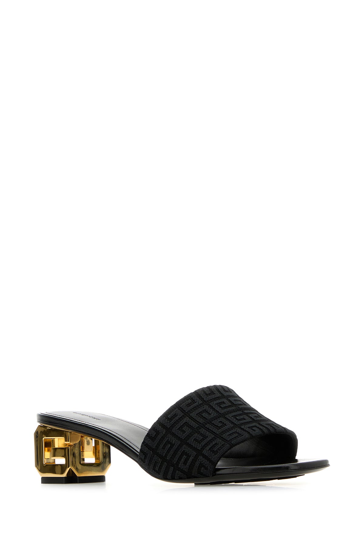 Mules realized in fabric characterized by tonal G Cube embroidery on the entire surface enriched by metal G Cube heel.