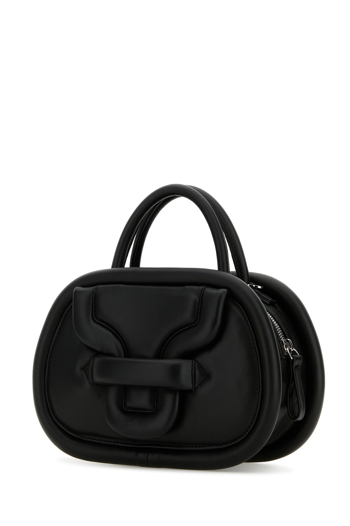 Handbag realized in slightly pebble lamb leather characterized by a flap ticket a the front.